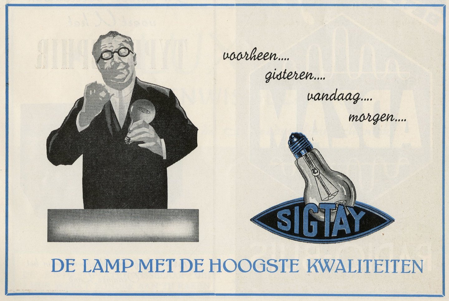 - opschriften: voorheen... / gisteren... / vandaag... / morgen... / DE LAMP MET DE HOOGSTE KWALITEIT