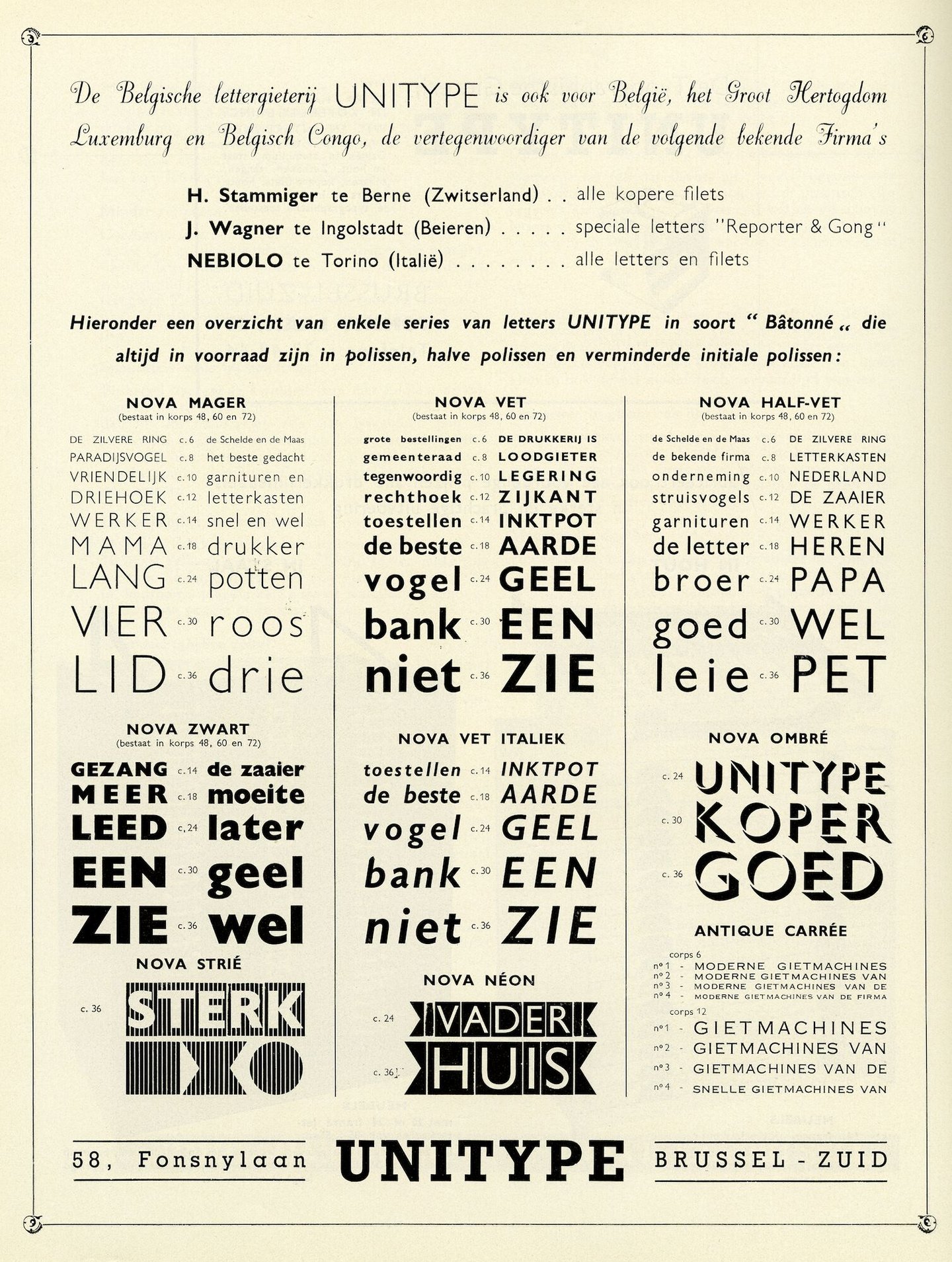 Advertentie met letterproeven van het lettertype Nova (soort Bâtonné) van Lettergieterij Unitype, gevestigd in de Fonsnylaan 58 te Brussel. Unitype is ook verdeler van lettermateriaal van de merken H. Stamminger, J. Wagner en Nebiolo.