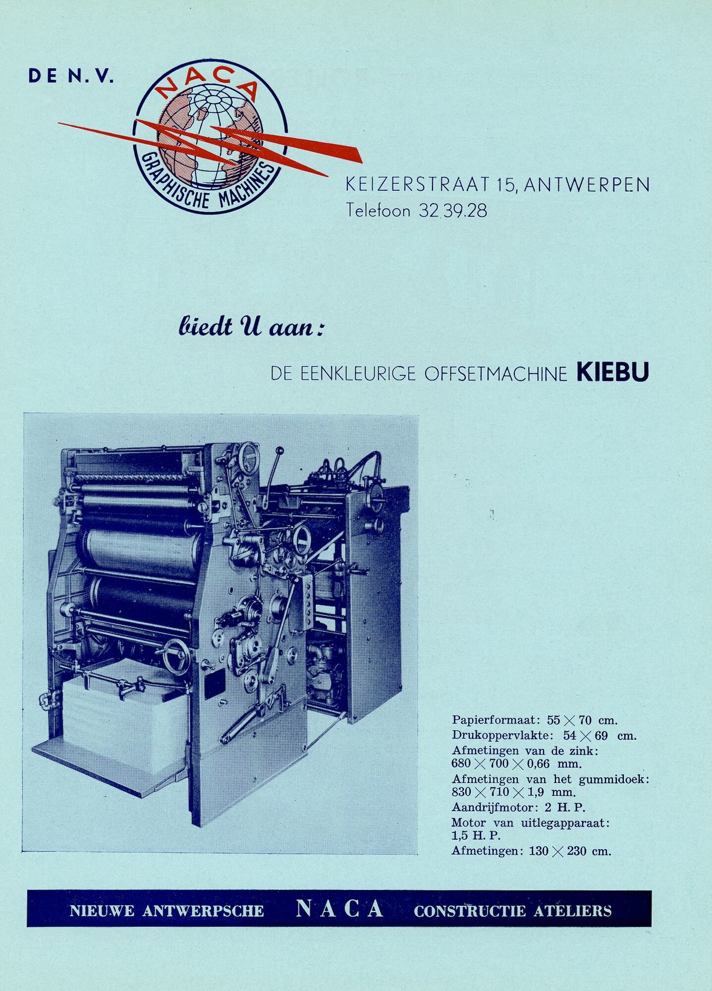 Advertentie voor de eenkleurige offsetpers Kiebu van het merk NACA (Nieuwe Antwerpsche Constructie Ateliers) gevestigd in de Keizerstraat 15 te Antwerpen.