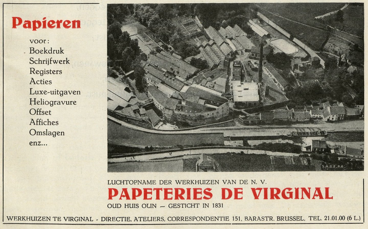 Advertentie voor verschillende types papier bruikbaar voor boekdruk, schrijfwerk, registers, heliogravure, offset, affiches, omslagen, etc. Geproduceerd door Papeteries de Viginal (oud Huis Olin) met werkhuizen te Virginal en afdelingen in de Barastraat 151 te Brussel.