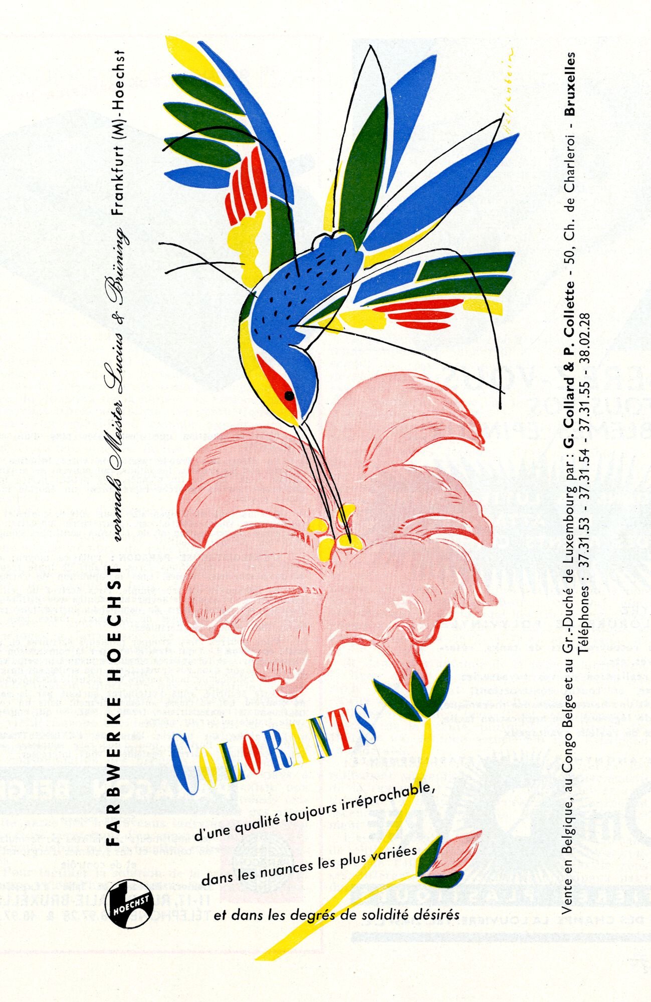 #textiel #publiciteit #informatie en communicatie #3de kwart 20ste eeuw #advertentie #chemie #textielveredeling #pigment en kleurstoffenproductie #verfstof #Hoechst Farbwerke AG #Meister Lucius & Brüning Farbwerke #Collard G. & Collette P.