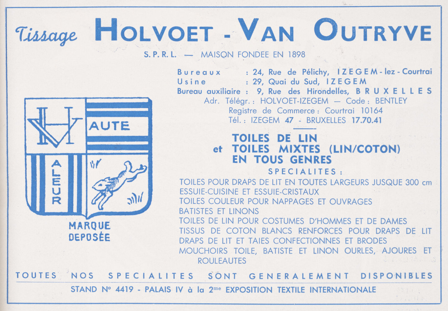 #textielfabriek #textiel #publiciteit #informatie en communicatie #weverij #3de kwart 20ste eeuw #advertentie #Holvoet-Van Outryve