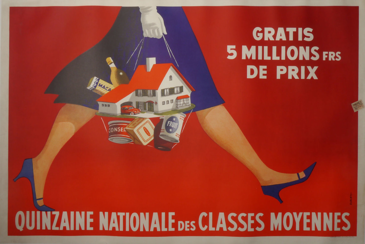 - opschriften: GRATIS 5 MILLIONS FRS DE PRIX / QUINZAINE NATIONALE DES CLASSES MOYENNES / IMPRIMERIE MARCI, 30, rue Bara, BRUXELLES // ROHONYI
