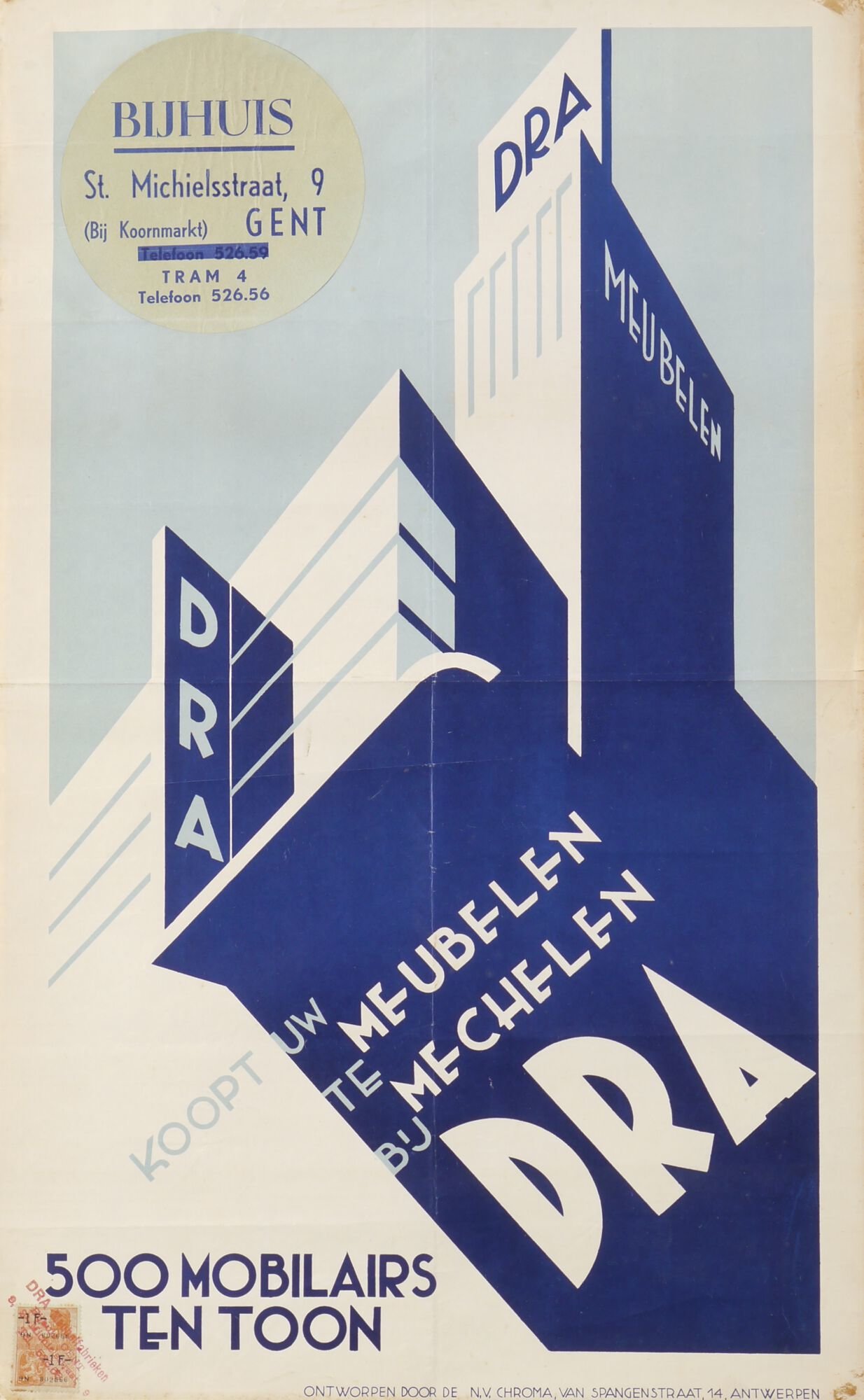 - opschriften: DRA / MEUBELEN / DRA / KOOPT UW / MEUBELEN / TE / MECHELEN / BIJ / DRA / 500 MOBILAIRS / TENTOON / ONTWORPEN DOOR DE N.V. CHROMA, VAN SPANGENSTRAAT, 14, ANTWERPEN