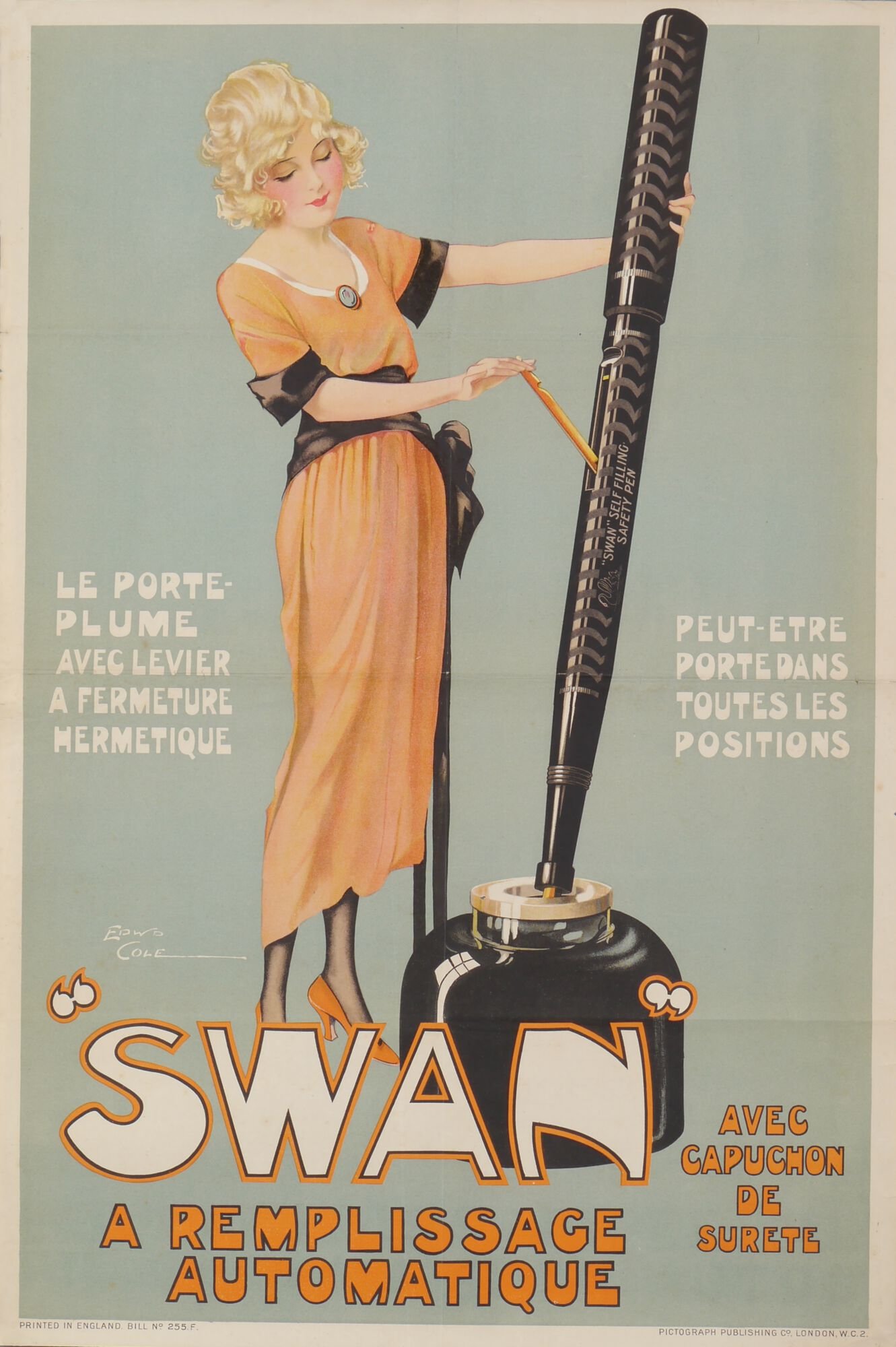 - opschriften: LE PORTE- / PLUME / AVEC LEVIER / A FERMETURE / HERMETIQUE // "SWAN" SELF FILLING / SAFETY PEN / PEUT-ETRE / PORTE DANS / TOUTES LES / POSITIONS // Edwd / Cole // "SWAN" / A REMPLISSAGE / AUTOMATIQUE // AVEC / CAPUCHON / DE / SURETE / PRINTED IN ENGLAND.