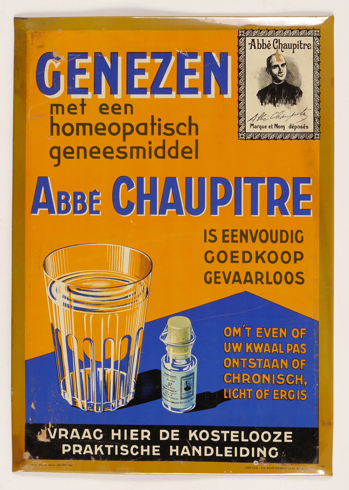 - opschriften: Genezen, Abbé Chaupitre. Genezen / met een / homeopatisch / geneesmiddel / Abbé Chaupitre / is eenvoudig / goedkoop / gevaarloos / om 't even of / uw / kwaal pas /ontstaan of / chronische, / licht of erg is / vraagt hier de kostelooze / praktische handlei