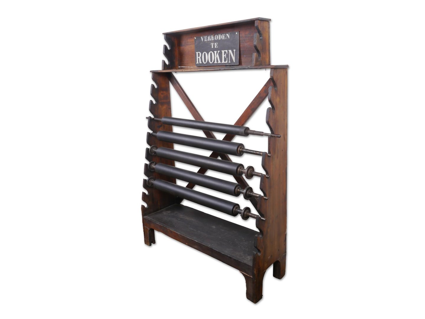 #metaal #hout #rubber #drukkerij #einde 19de eeuw #cilinderpers #meubilair #inktrol #rek