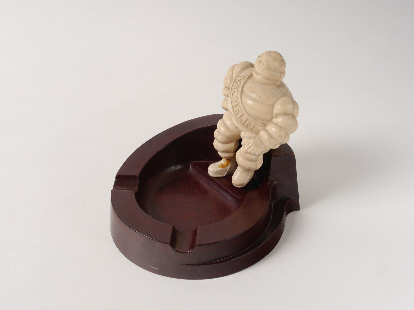 Asbak in bruine bakeliet met twee uitsparingen, verspreid als reclame voor Michelin. Met mascotte Bibendum of 'het Michelinmannetje' in witte kunststof, vermoedelijk ureumformaldehyde.