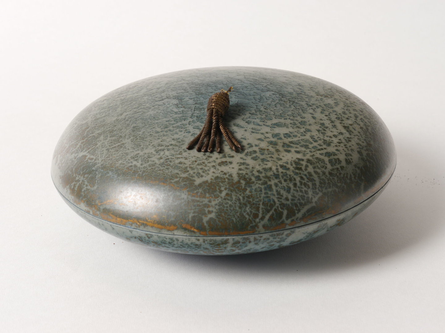Ronde sierdoos met kwast uit groene metaaldraad op het deksel, geperst door de Antwerpse firma Ebena uit een eigen harsmengeling met kopal uit Congo en kleurpigmenten. Binnenkant in blauw, gemarmerd effect en verguld.