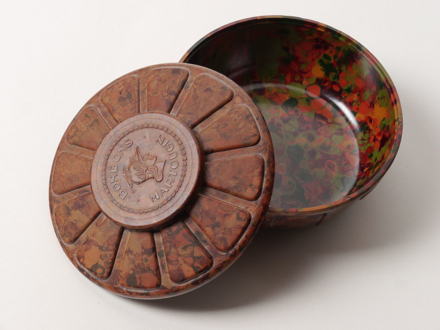 Ronde snoepjesdoos of bonbonnière met afneembaar deksel voor chocolade van het merk Martougin, vermoedelijk geproduceerd door de Antwerpse firma Ebena. Aan de binnenkant bruingemarmerd.