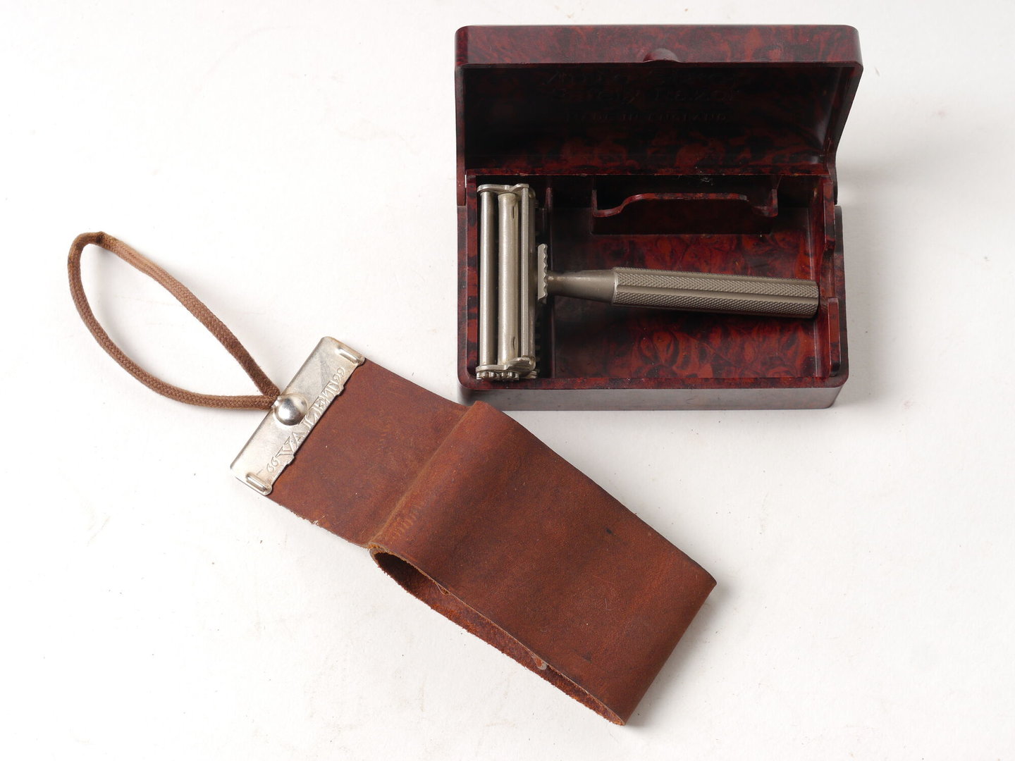 #wonen #metaal #bakeliet #2de kwart 20ste eeuw #leer #verzorgen #scheergerei #scheermes #Valet