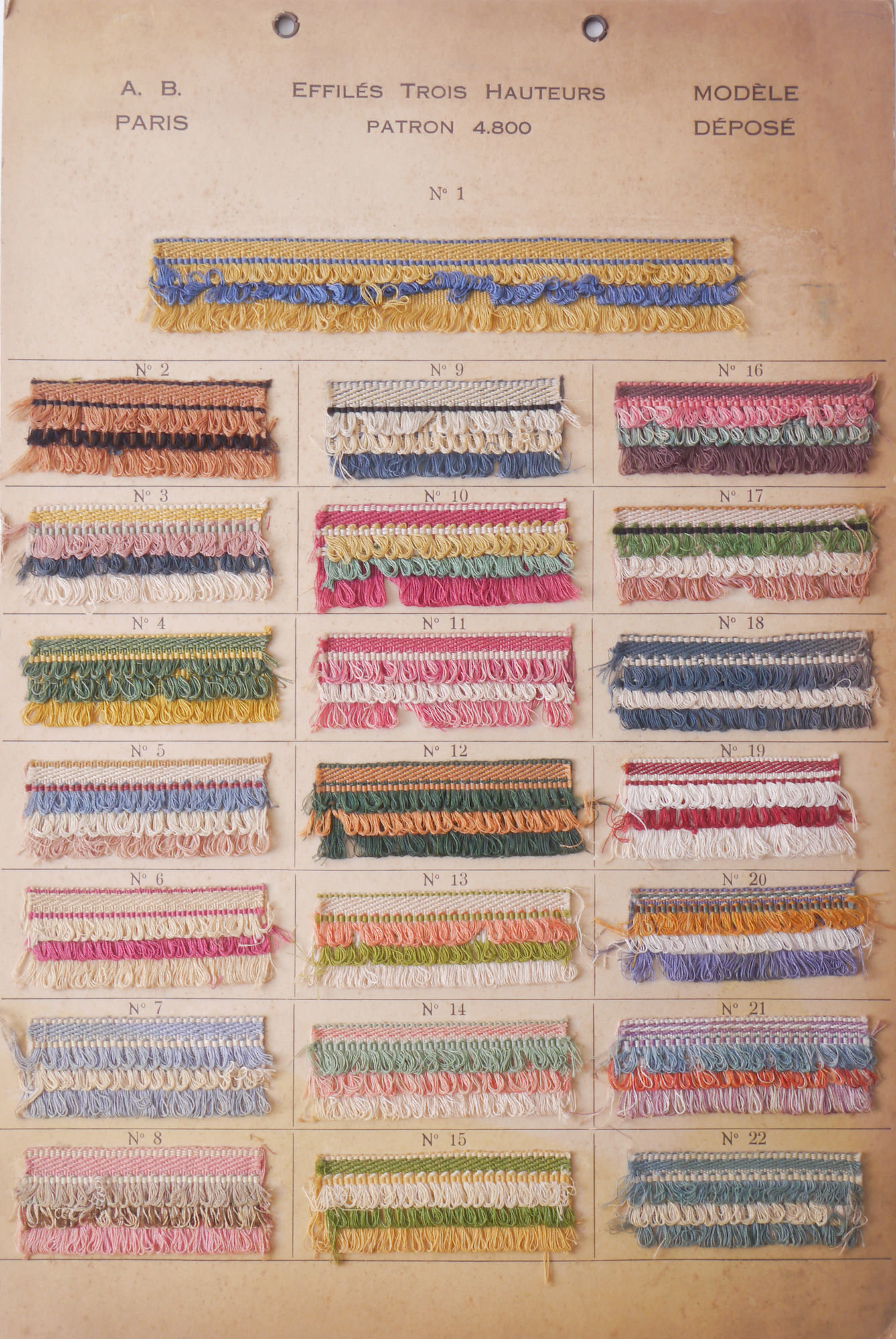 - opschriften: A.B. / PARIS / EFFILÉS TROIS HAUTEURS / PATRON 4.800 / MODÈLE / DÉPOSÉ