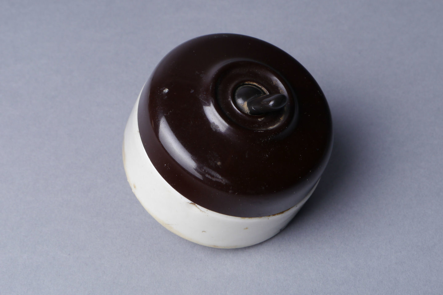 V20992 Tuimelschakelaar, combinatie porselein en bakeliet, General Electric Co. Ltd of England, ca 1930.