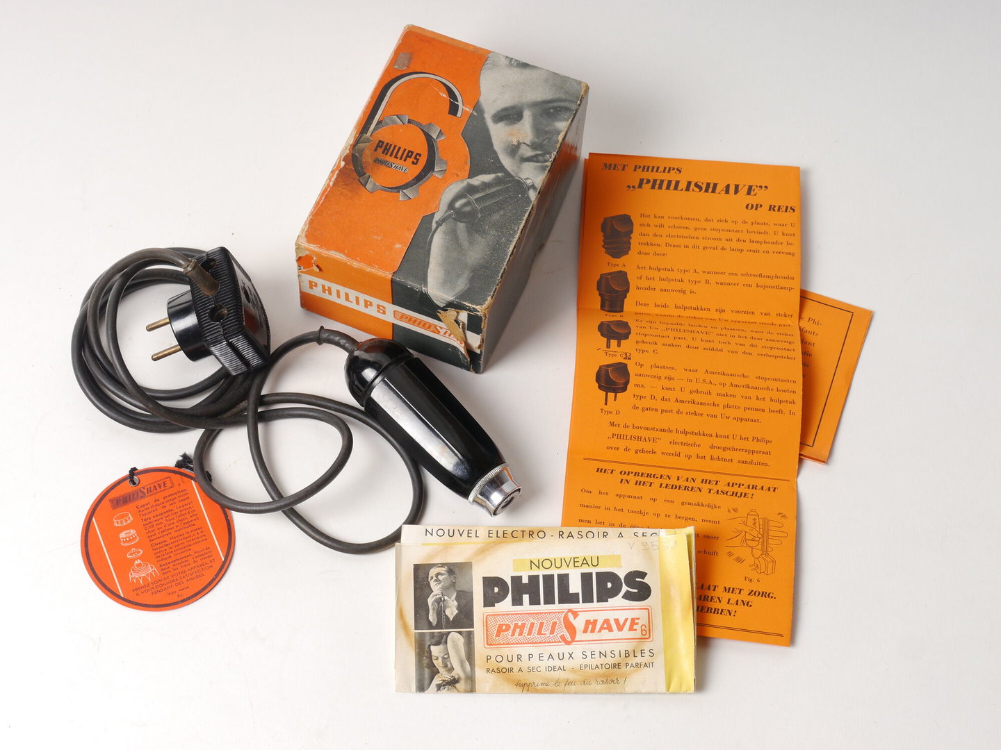 V09530 Elektrisch scheerapparaat, Philips, type Philishave 6, 7736, 1941 De Philishave met ronde scheerkop, ook wel sigaar genoemd, komt in 1939 op de markt. De bakelieten behuizing volgt de ronde, langwerpige vorm van het motortje. De staaf ligt goed in de hand en vier gleuven in de lengterichting zorgen voor extra grip en karakter.