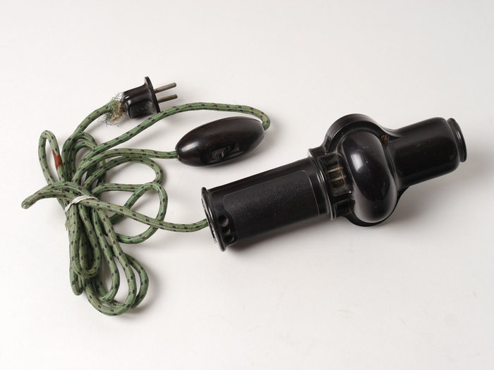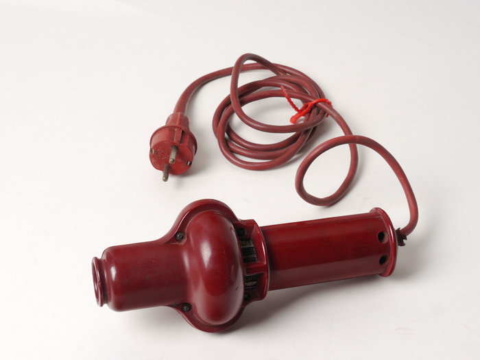 V09511 V09512 Haardroger Siemens, type Edi, ontworpen door Herbert Marloth in 1936 Deze bakelieten haardroger van Siemens, die tot 1960 in productie bleef, was verkrijgbaar in diverse kleuren. Collectie Industriemuseum.