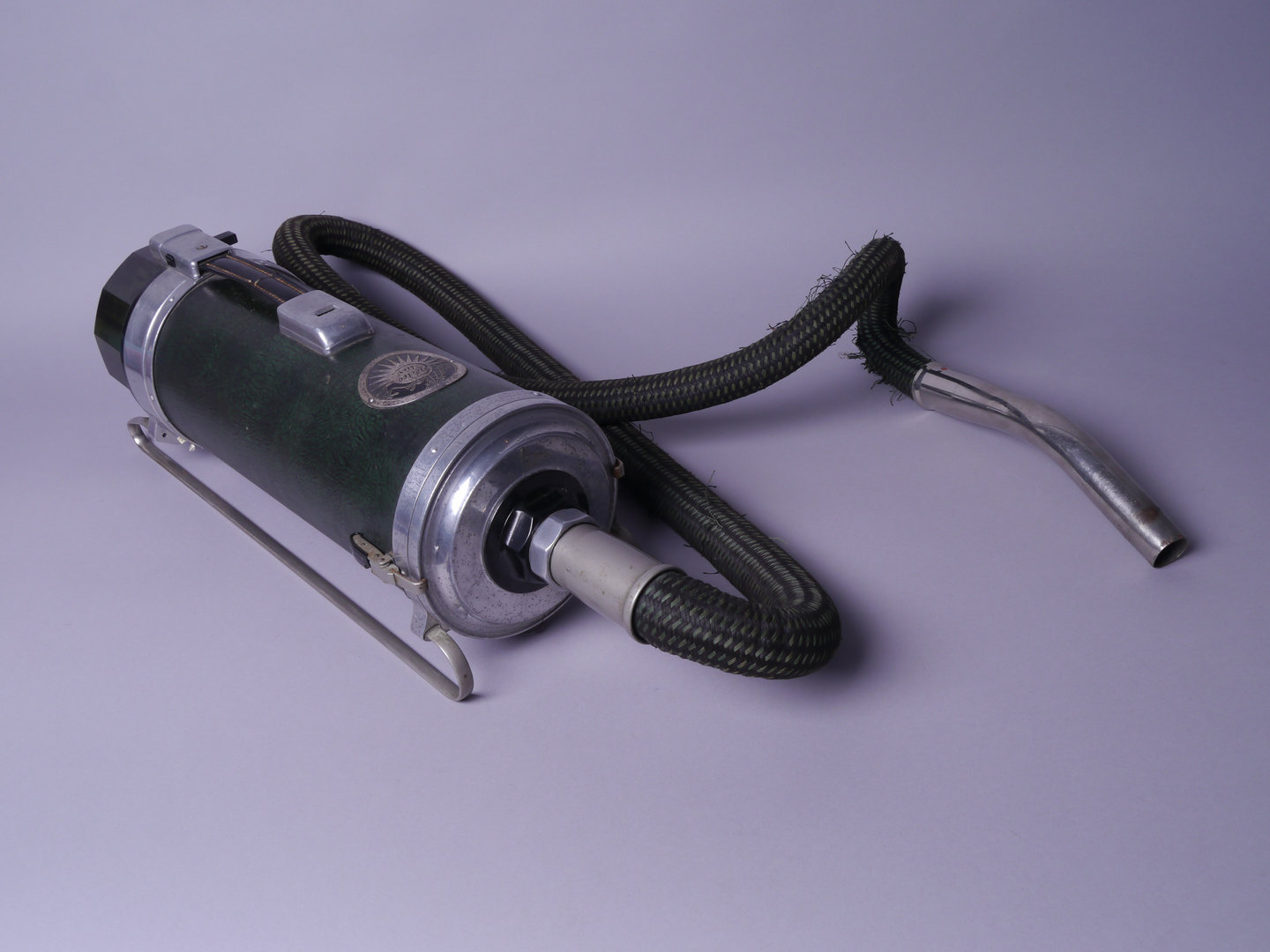 V01704 Elektrisch stofzuiger van het merk Electrolux, type Z25, gemaakt in 1935. Elektrolux brengt als eerste een sledestofzuiger op de markt. Het toestel wordt op metalen geleiders over de vloer getrokken .