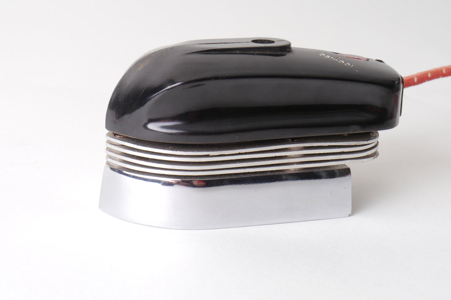 V09992 Compact reisstrijkijzer Smoothie van het merk Lucas Holder, 1947. De verchroomde lamellen dienen als eerste thermische onderbreking tussen de zool en het bakelieten handvat. De aerodynamische vormgeving of streamline is geïnspireerd op de beweging van vliegtuigen, locomotieven en auto's. Alles duidt op snelheid en vooruitgang.