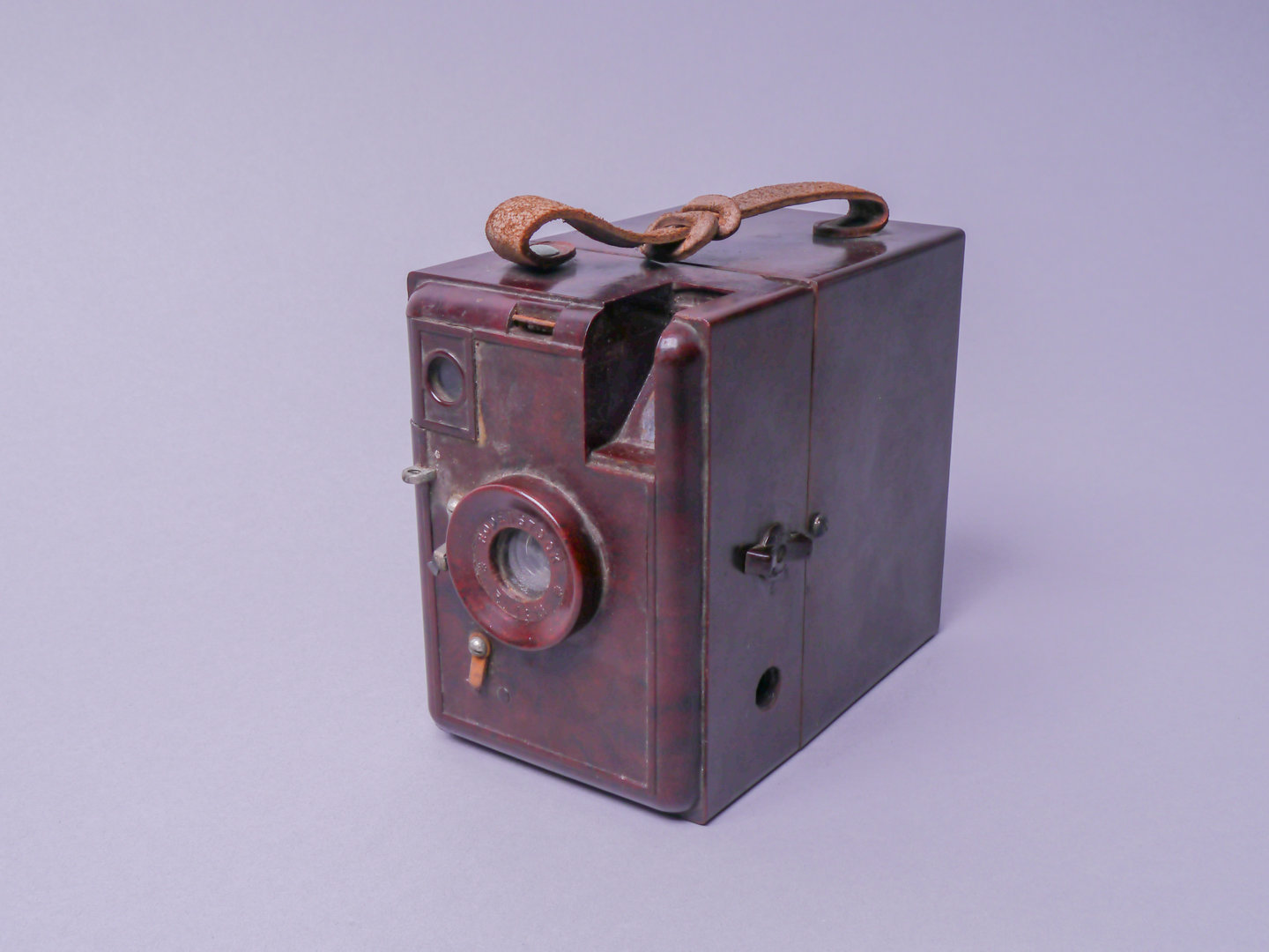 V08373 Merten Merit Box, 1933. De vorm van deze in Duitsland gemaakte bakelieten boxcamera imiteert nog de vorm van de metalen boxcamera’s die Eastman Kodak op de markt bracht.