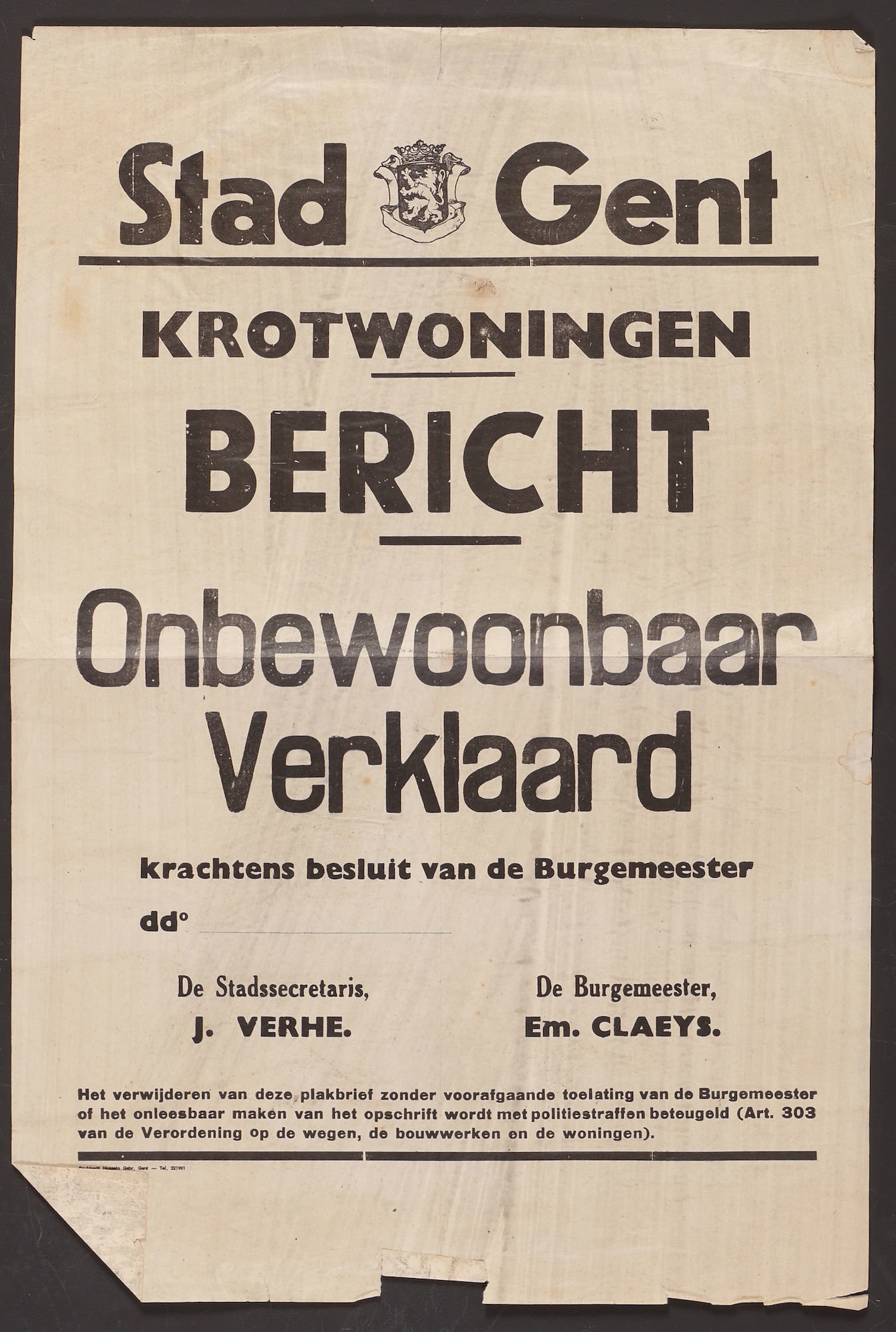 - opschriften: Stad Gent / KROTWONINGEN / BERICHT / Onbewoonbaar / Verklaard / krachtens besluit vaén de Burgemeester / dd° ...................... / De Stadssecretaris, / J. VERHE. / De Burgemeester / Em. CLAEYS. / Het verwijderen van deze plakbrief zonder voorafgaande