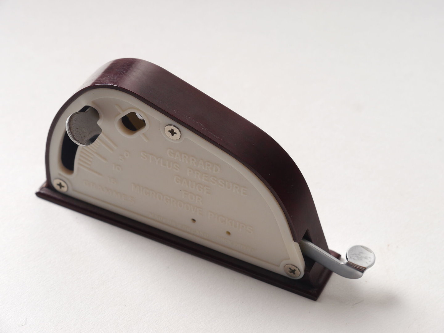- opschriften: GARRARD STYLUS PRESSURE GAUGE FOR MICROGROOVE PICK-UPS MADE IN ENGLAND PROV PATENT.