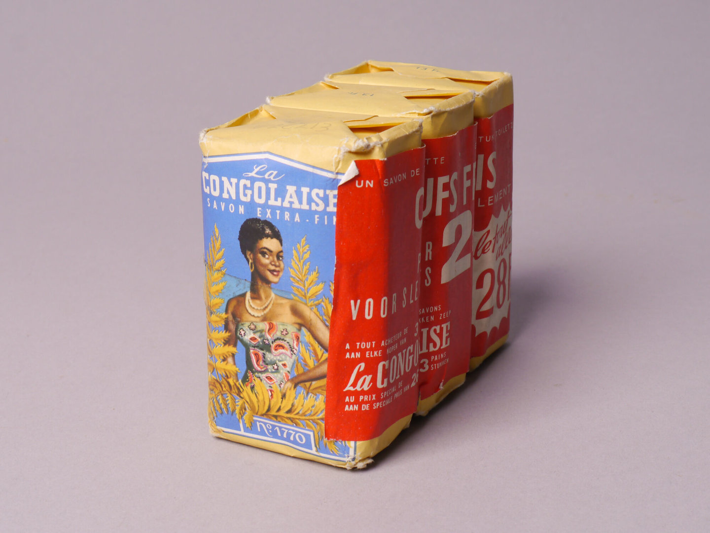 - opschriften: EEN STUK TOILETZEEP / OEUFS FRAIS / VOOR SLECHTS 2 Fr. / AAN ELKE KOPER VAN 3 STUKKEN ZEEP / La CONGOLAISE / AAN DE SPECIALE PRIJS VAN 26 Fr. DE 3 STUKKEN / alles 28 Fr. // La CONGOLAISE / SAVON EXTRA - FIN / N° 1770 // 96 Gr. AG // 13 Fr.