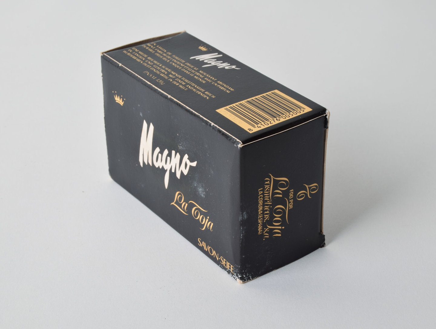 - opschriften: Magno / La Toja / JABON . SOAP // MADE BT / La Toja / cosmeticos s.a. / LA CORUNA (SPAIN) // Magno / A MILD, RICH-LATHERING TOILET SOAP, RICH IN LANOLIN AND / GLYCERIN, WITH LASTING DELIGHTFUL FRAGRANCE, UNIQUE / IN THE WORLD / INGREDIENTES: / SODIUM TALL