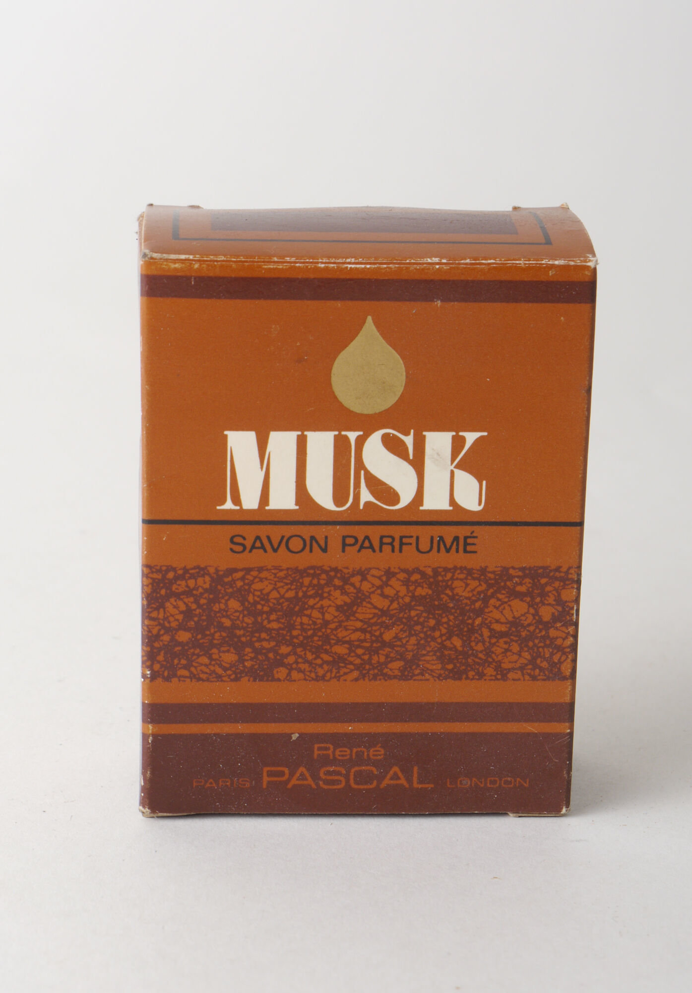 - opschriften: MUSK / SAVON PARFUMÉ / René / PARIS PASCAL LONDON // 85 g 68 A.G. 3OZ / René / Pascal / PARIS-LONDON