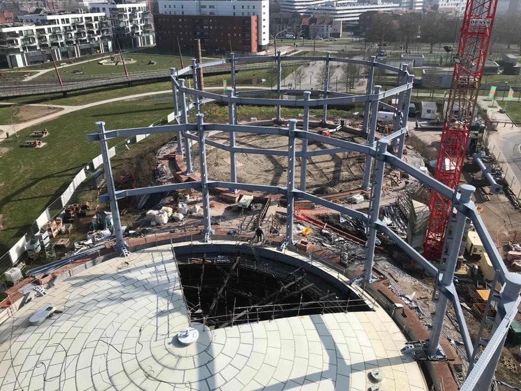 De houten steunstructuur binnenin de gashouder komt tevoorschijn, wanneer de bovenkant van de klok tijdens de restauratiewerken verwijderd wordt om te vernieuwen. Foto, 2020. Denys.
