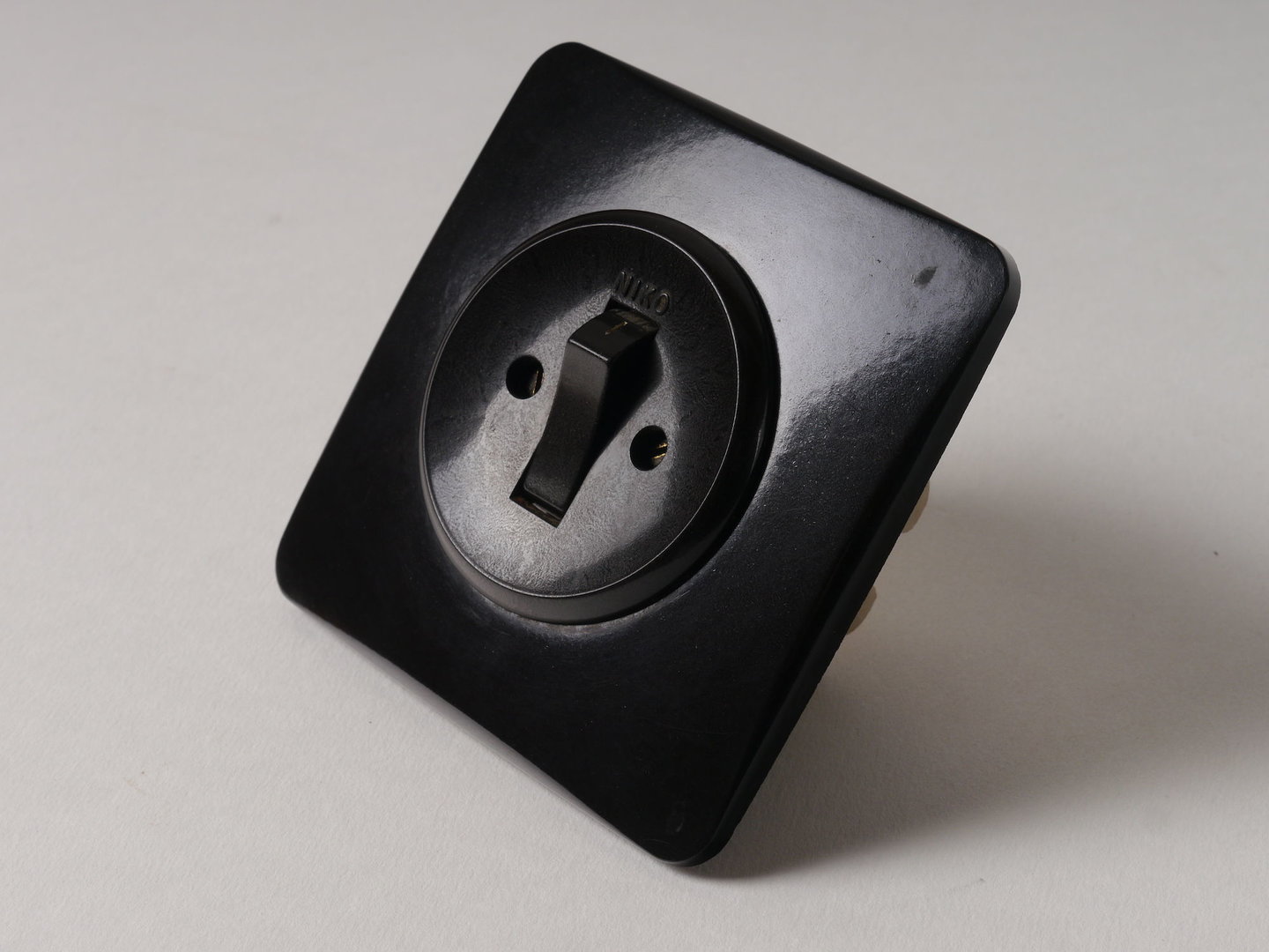 Vierkante lichtschakelaar in bruine bakeliet geproduceerd door Niko in Sint-Niklaas. In 1957 brengt Niko de wipschakelaar op de markt, die werkt met drukcontacten. De wipschakelaar schakelt daarom soepeler en met minder geluid dan de traditionele tuimelschakelaar, die een duidelijke klik laat horen.