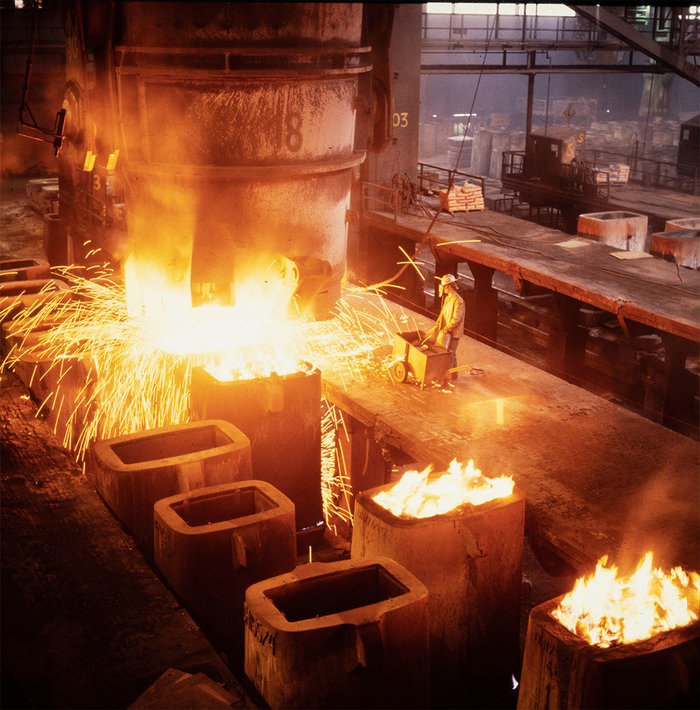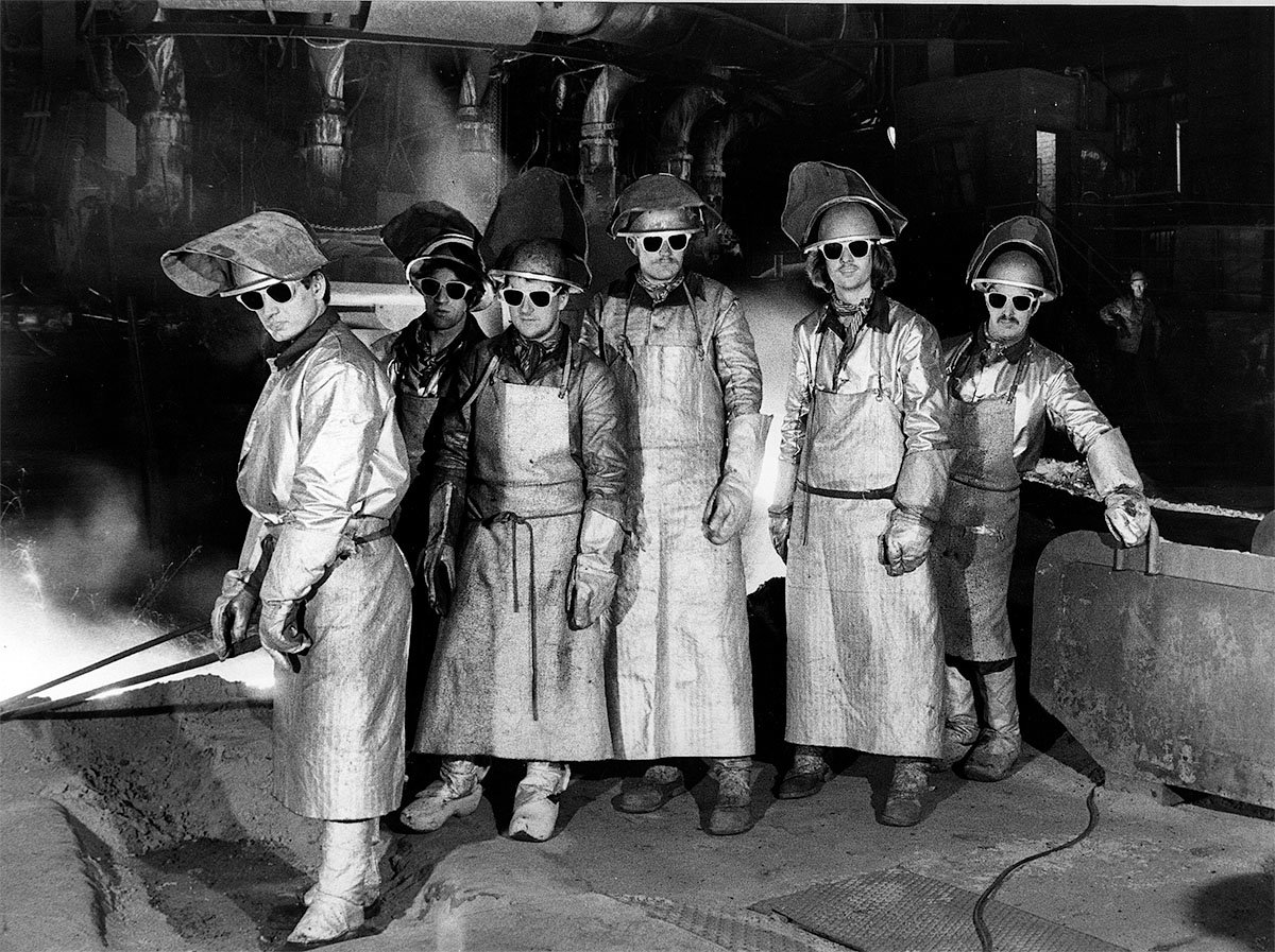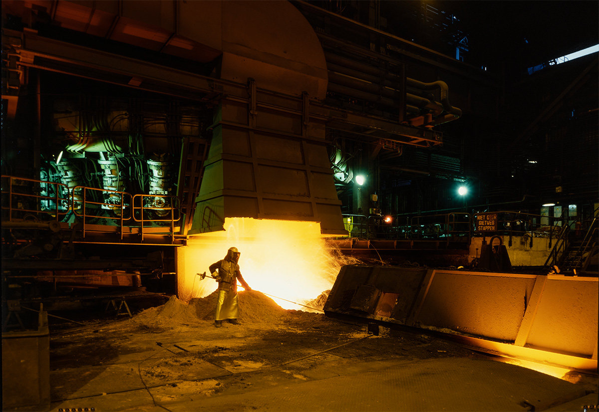 Foto bovenaan: Smelters op de gietvloer van de hoogoven bij Sidmar in Gent. Foto L. Moris, 1974. Collectie ArcelorMittal Belgium