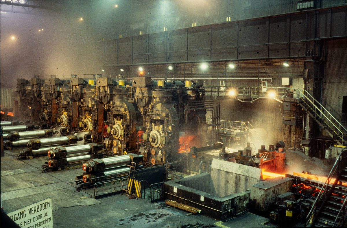 De warmwalserij bij ArcelorMittal Belgium in Gent. Foto J. Van den Berghe, eind jaren 1980. Collectie ArcelorMittal Belgium