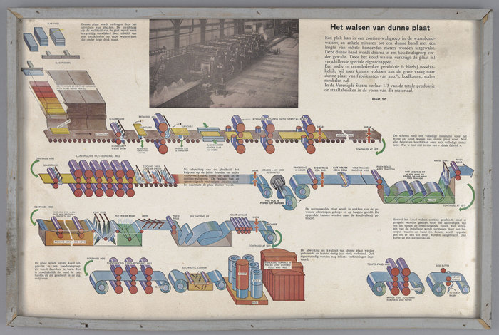 Didactische kleurenplaten over het koudwalsen en het elektrolytisch vertinnen van stalen platen. Bij dat laatste worden de gewalste stalen platen voorzien van een tinnen afwerkingslaag om ze tegen corrosie te beschermen. Collectie Industriemuseum