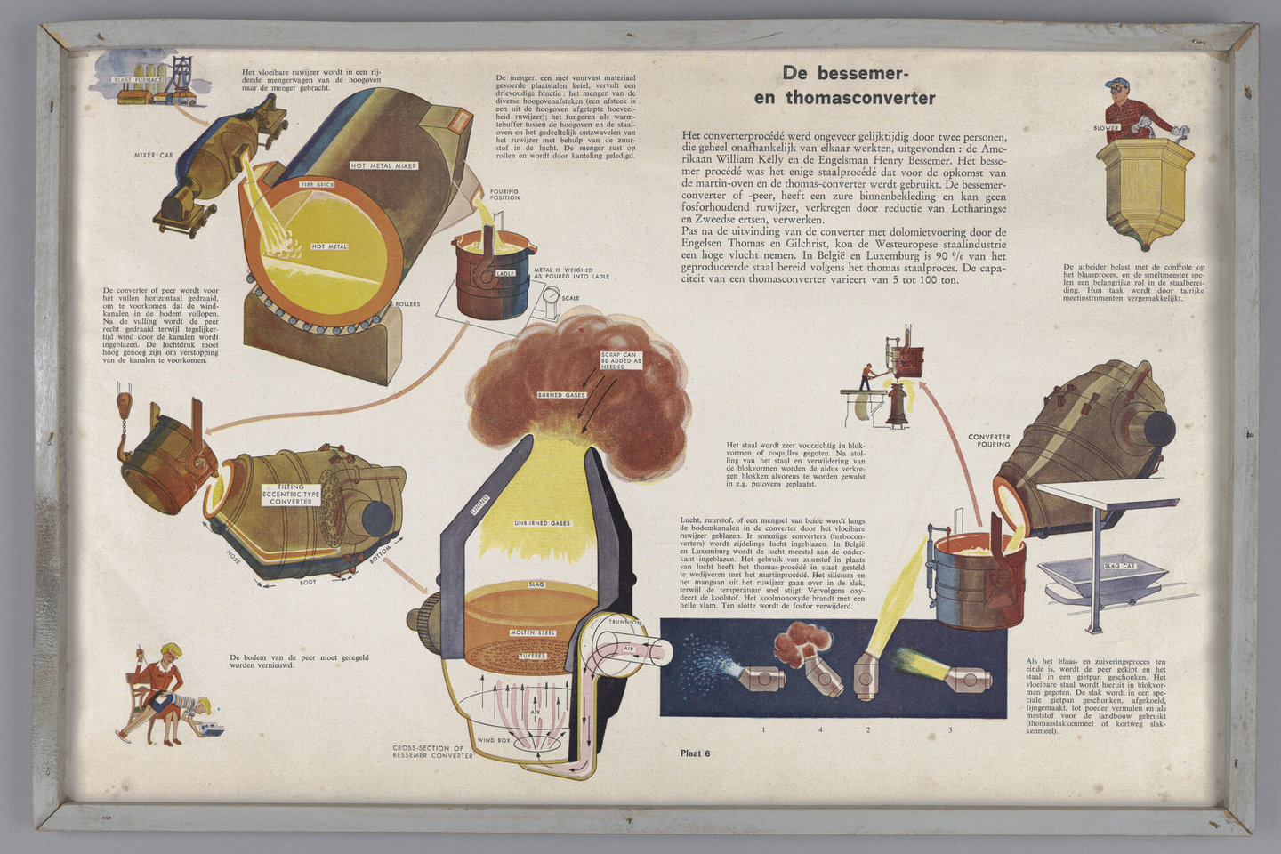 Didactische kleurenplaat over de werking van een bessemer- en thomasconverter voor de productie van staal. Collectie Industriemuseum