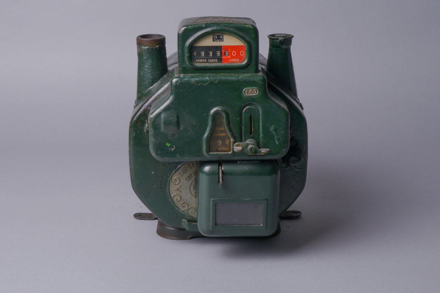 - opschriften: EAU-GAZ-ELECTRICITÉ ET APPLICATIONS / 140 RUE DE STALLE - UCCLE BRUXELLES / COMPTEUR 10 BECS / N° 1564198 / 1400 LITRES À L'HEURE / 1945 / E.G.E.A.