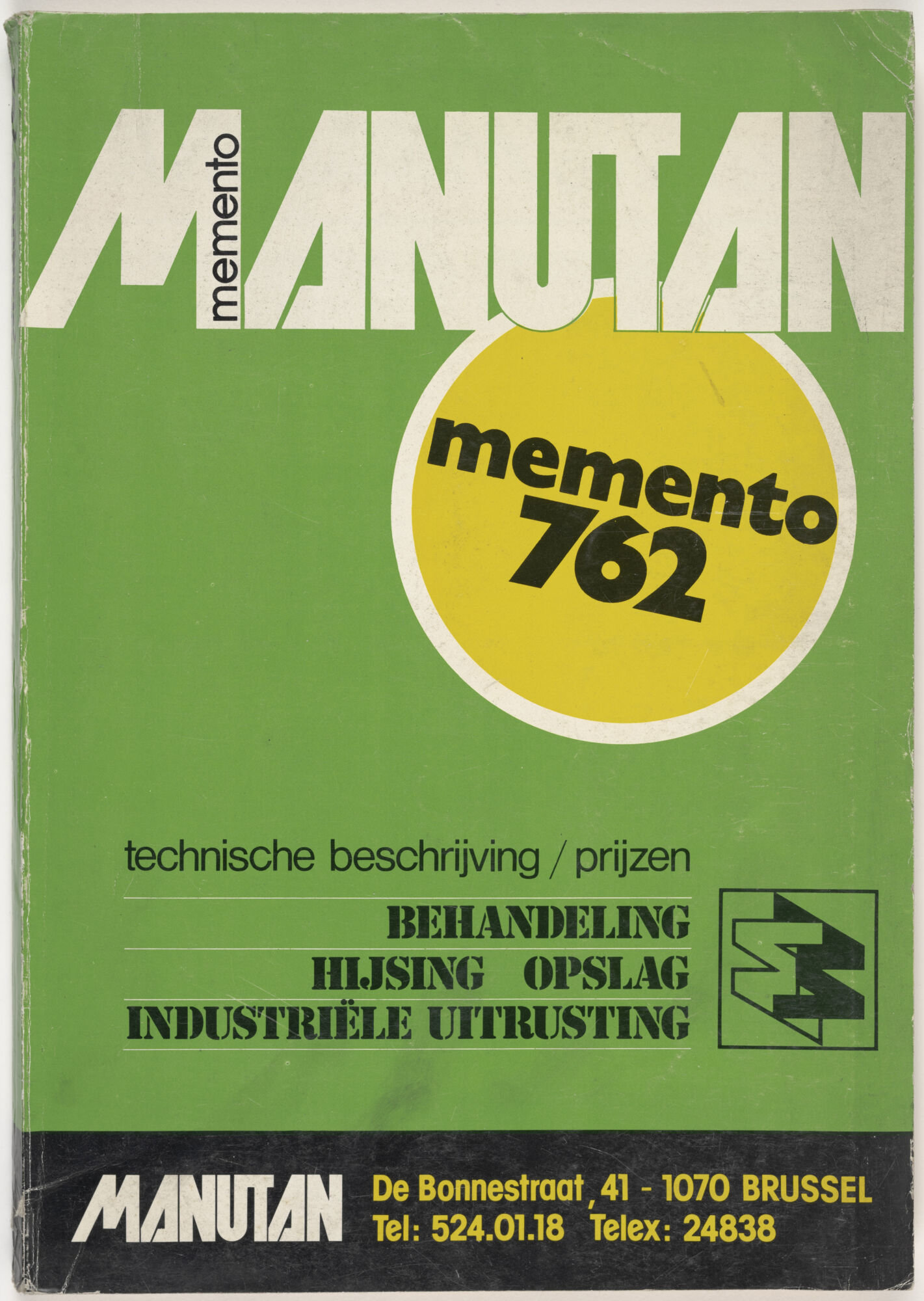 - opschriften: MANUTAN / memento 762 / technische beschrijvin / prijzen / BEHANDELING / HIJSING OPSLAG / INDUSTRIËLE UITRUSTING / MANUTAN / De Bonnestraat, 41 - 1070 BRUSSEL / Tel: 524.01.18 Telex: 24838