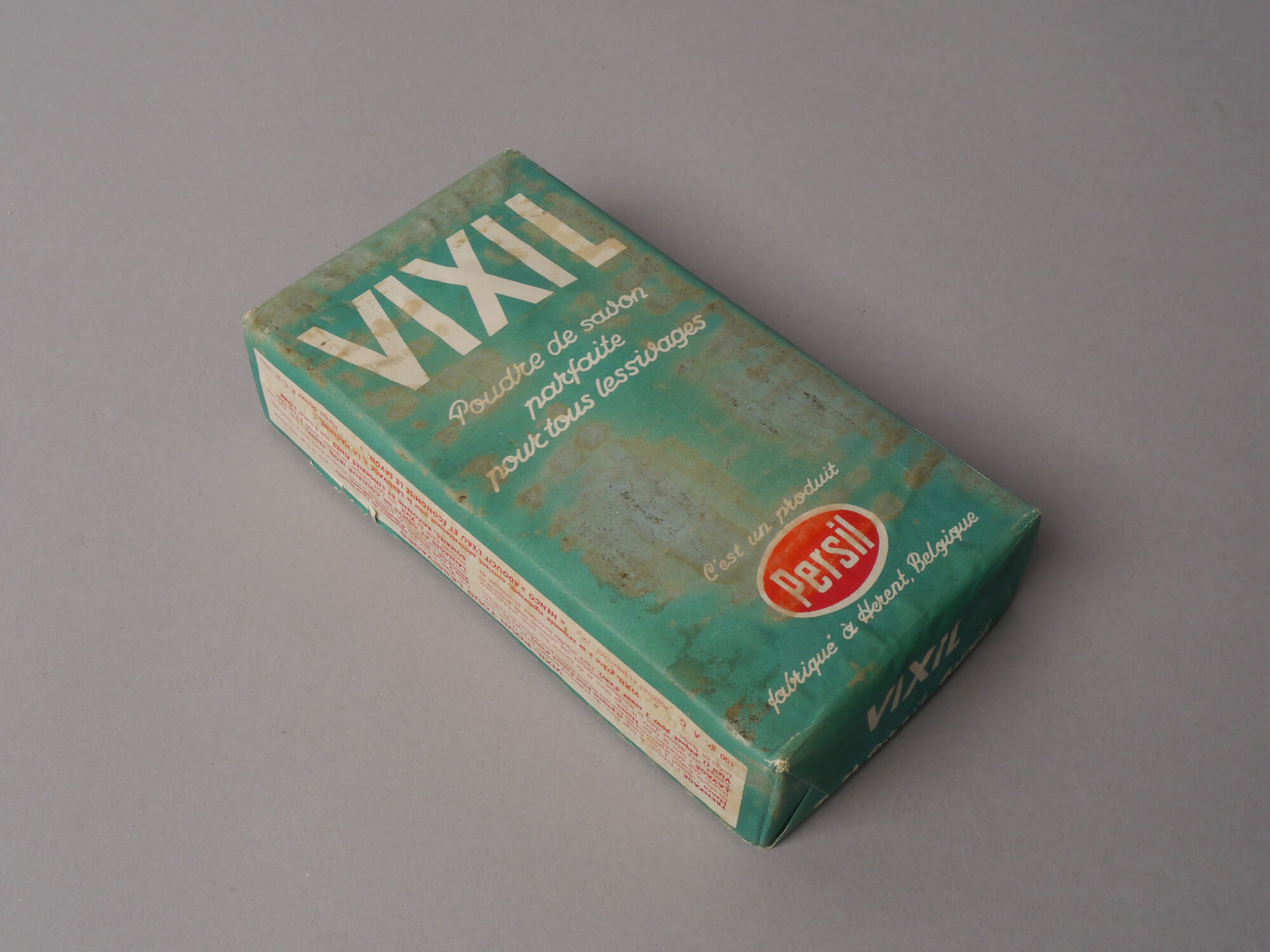 - opschriften: VIXIL / Volmaakt / zeeppoeder / voor alle was / Het is een product / Persil / vervaardigd te Herent, België