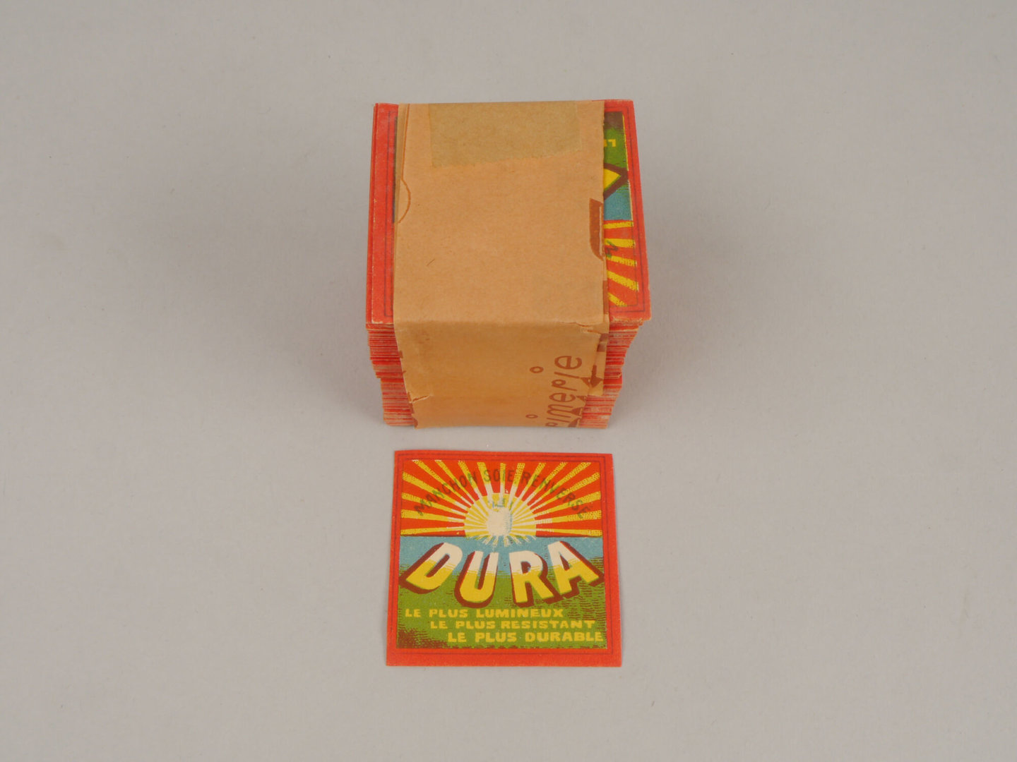 - opschriften: MANCHON SOIE RENVERSÉ / DURA / LE PLUS LUMINEUX / LE PLUS RESISTANT / LE PLUS DURABLE