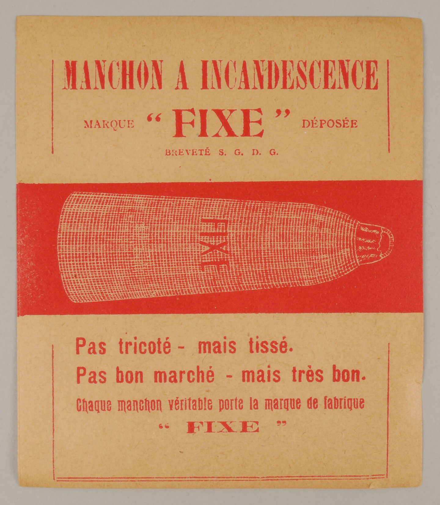 - opschriften: MANCHON À INCANDESCENCE / MARQUE "FIXE" DÉPOSÉE / BREVETÉ S.G.D.G. // Pas tricoté - mais tissé. / Pas bon marché - mais très bon. / Chaque manchon véritable porte la marque de fabrique / "FIXE"