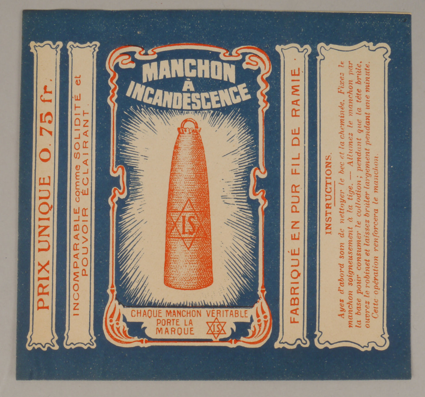 - opschriften: PRIX UNIQUE 0,75 fr. // INCOMPARABLE COMME SOLIDITÉ ET / POUVOIR ÉCLAIRANT // MANCHON À INCANDESCENCE // CHAQUE MANCHON VÉRITABLE / PORTE LA I.S. / MARQUE // FABRIQUÉ EN PUR FIL DE RAMIE // INSTRUCTIONS. / Ayez d'abord soin de nettoyer le bec et la chemin