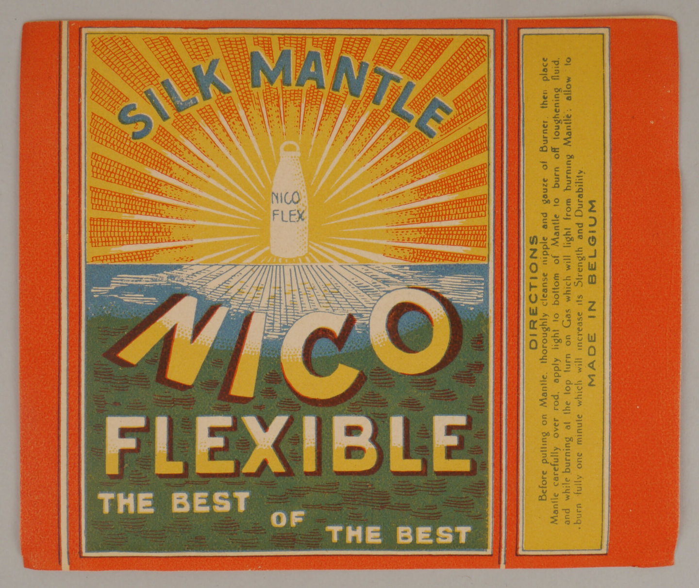 - opschriften: SILK MANTLE / NICO FLEX / NICO / FLEXIBLE / THE BEST OF THE BEST // DIRECTIONS / Before putting on Mantle, thoroughly cleanse nipple and gauze of burner, then place / Mantle carefully over rod, apply light to bottom of Mantle to burn off toughening fluid,