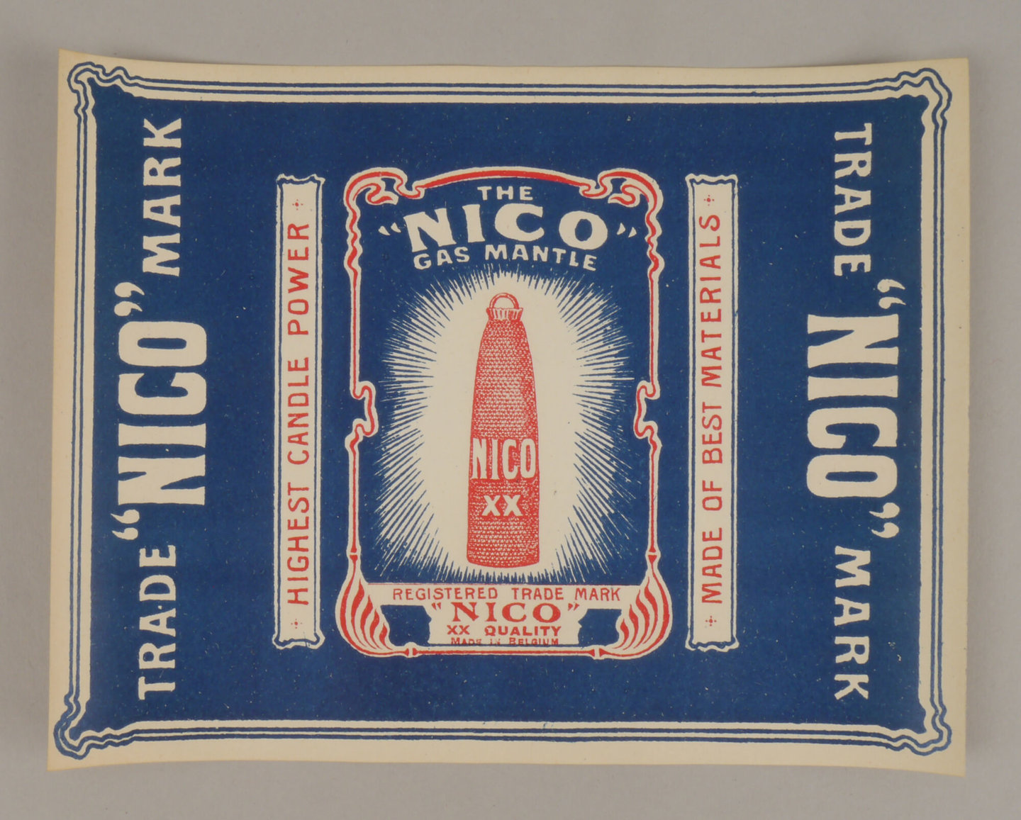 - opschriften: TRADE "NICO" MARK / HIGHEST CANDLE POWER / THE "NICO" GAS MANTLE / REGISTERED TRADE MARK / "NICO" / XX QUALITY / MADE IN BELGIUM / MADE OF BEST MATERIALS
