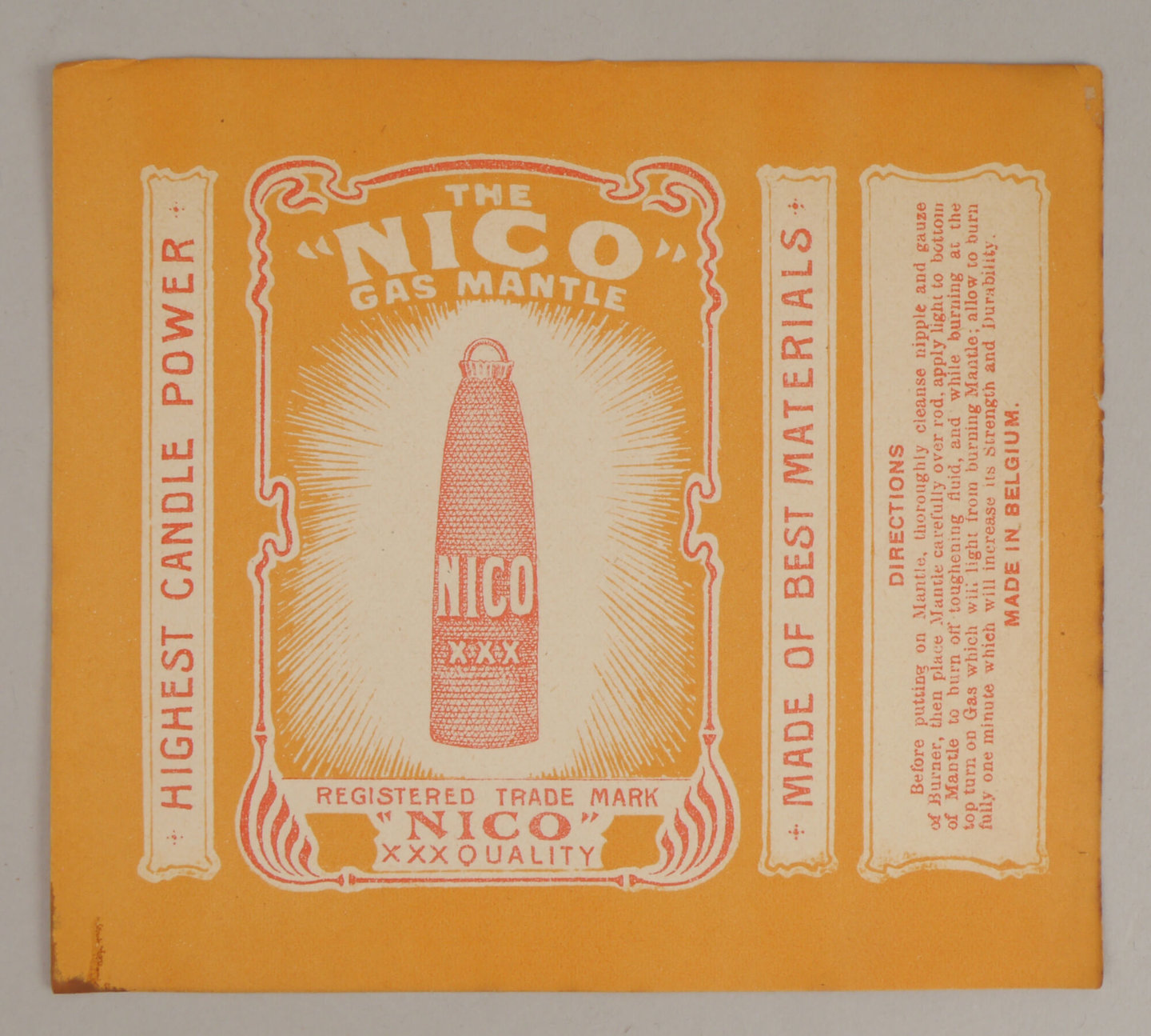 - opschriften: HIGHEST CANDLE POWER // THE / "NICO" / GAS MANTLE // REGISTERED TRADE MARK / "NICO" / XXX QUALITY // MADE OF BEST MATERIALS // DIRECTIONS / Before putting on Mantle, thoroughly cleanse nipple and gauze / of burner, then place Mantle carefully over rod, ap
