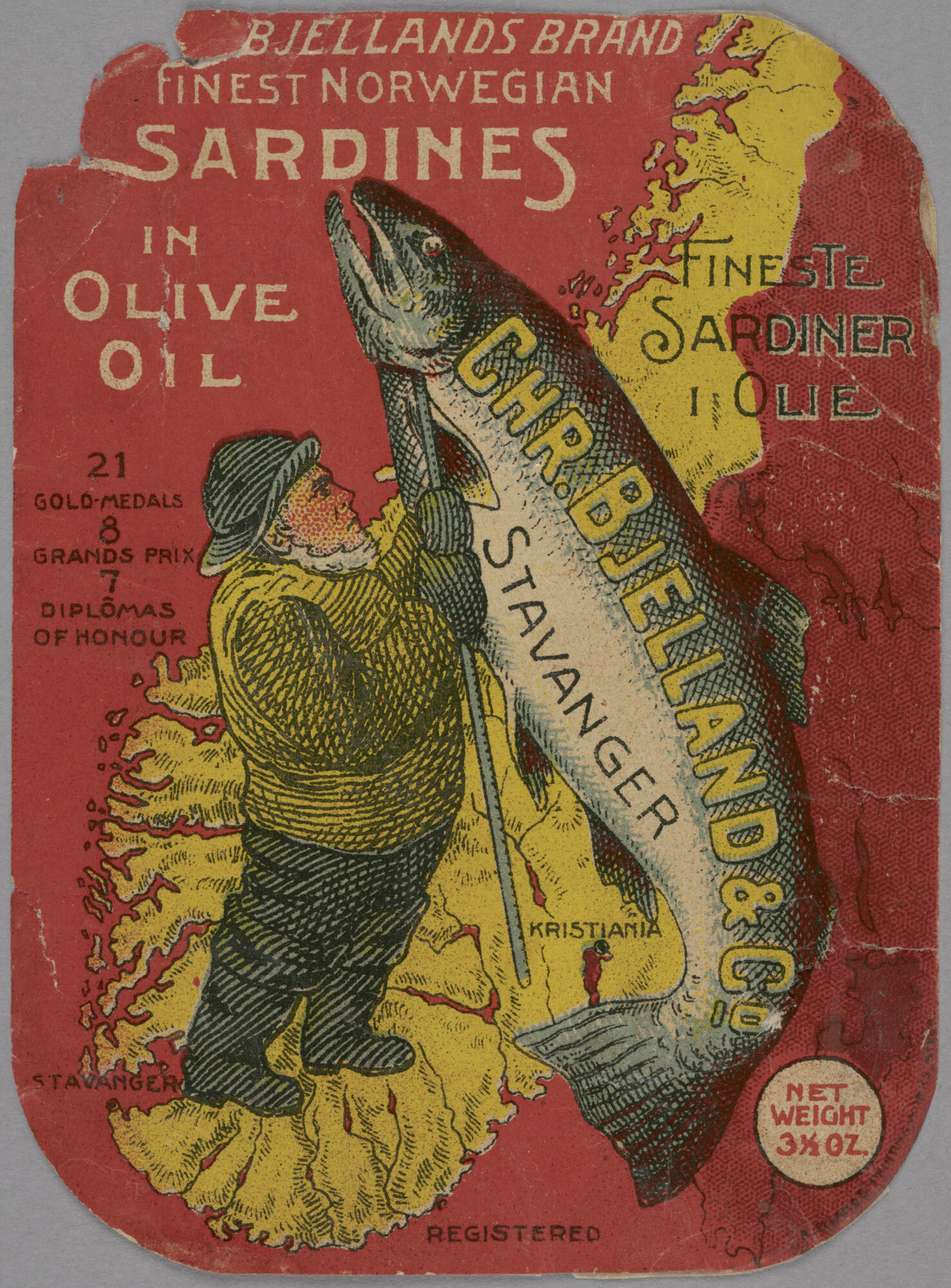 - opschriften: Bjellands brand / finest Norwegian / sardines / in / olive / oil / fineste / sardiner / olie / Chr. Bjelland & Co / Stavanger / 21 / gold-medals / 8 / grands prix / 7 diplômas of honour