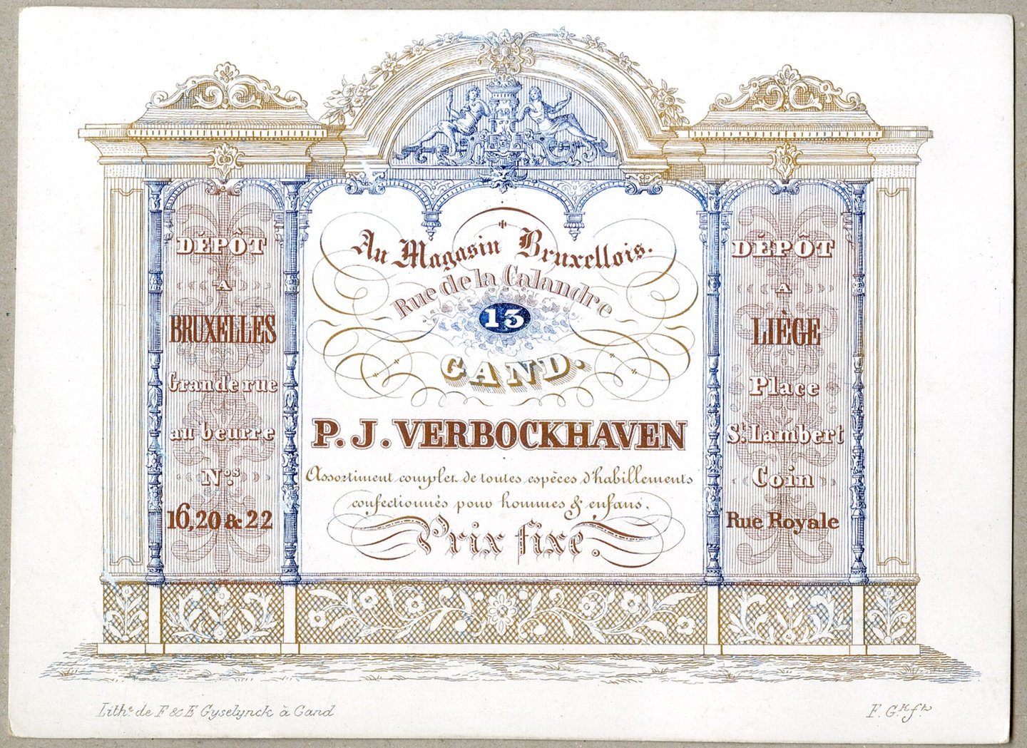- opschriften: Au Magasin Bruxellois. / Rue de la Calandre / 13 / Gand / P.J. Verbockhaven / Assortiment complet de toutes espèces d'habillements / confectionnés pour hommes & enfans. / Prix fixe. / dépôt / à / Bruxelles / Grande rue / au beurre / N° / 16,20 & 22 / Dépô