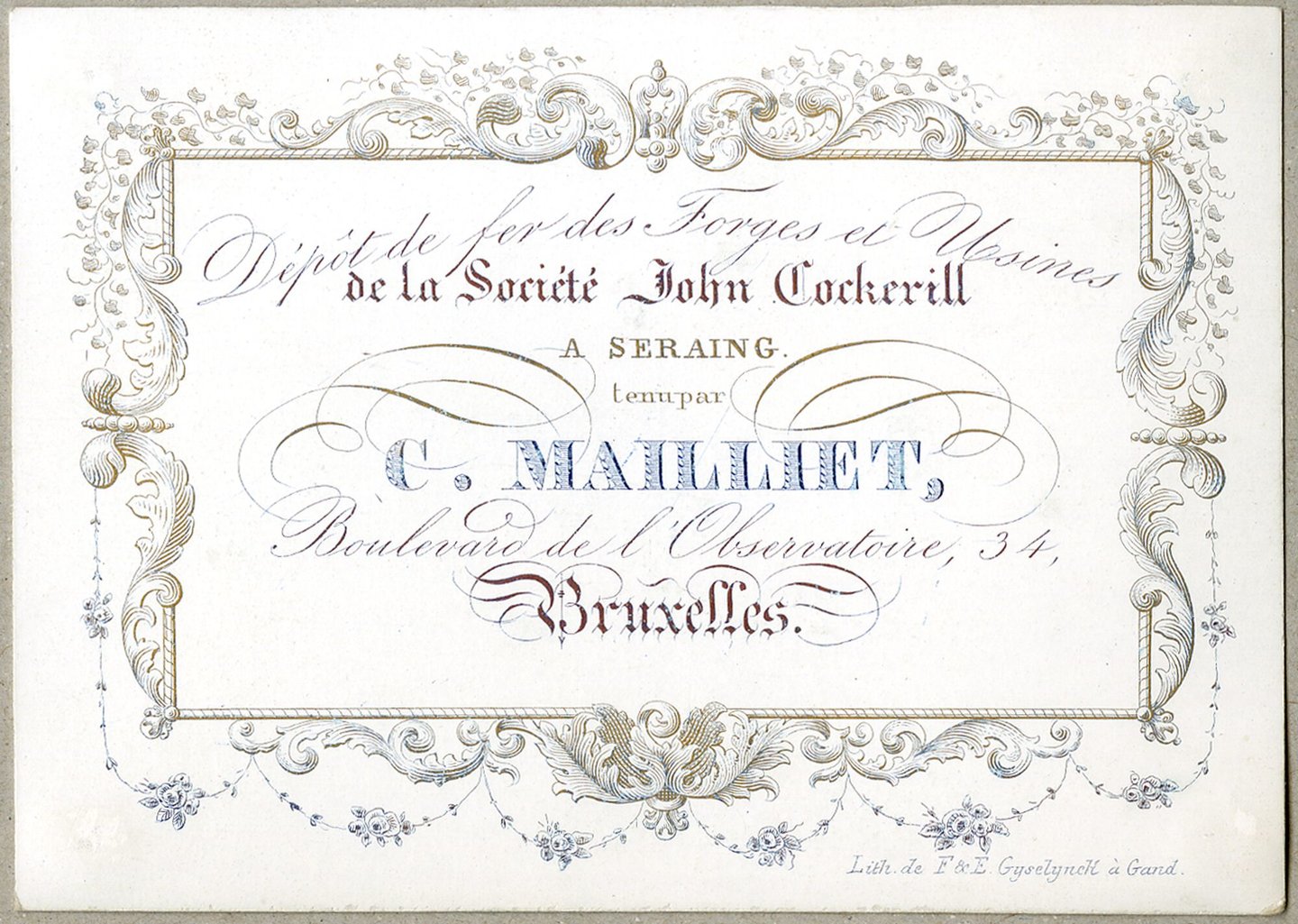 - opschriften: Dépôt de fer des forges et usines / de la société John Cockerill / A SERAING / tenu par / C. Mailliet ,/ Boulevard de l'Observatoire, 34, / Bruxelles.