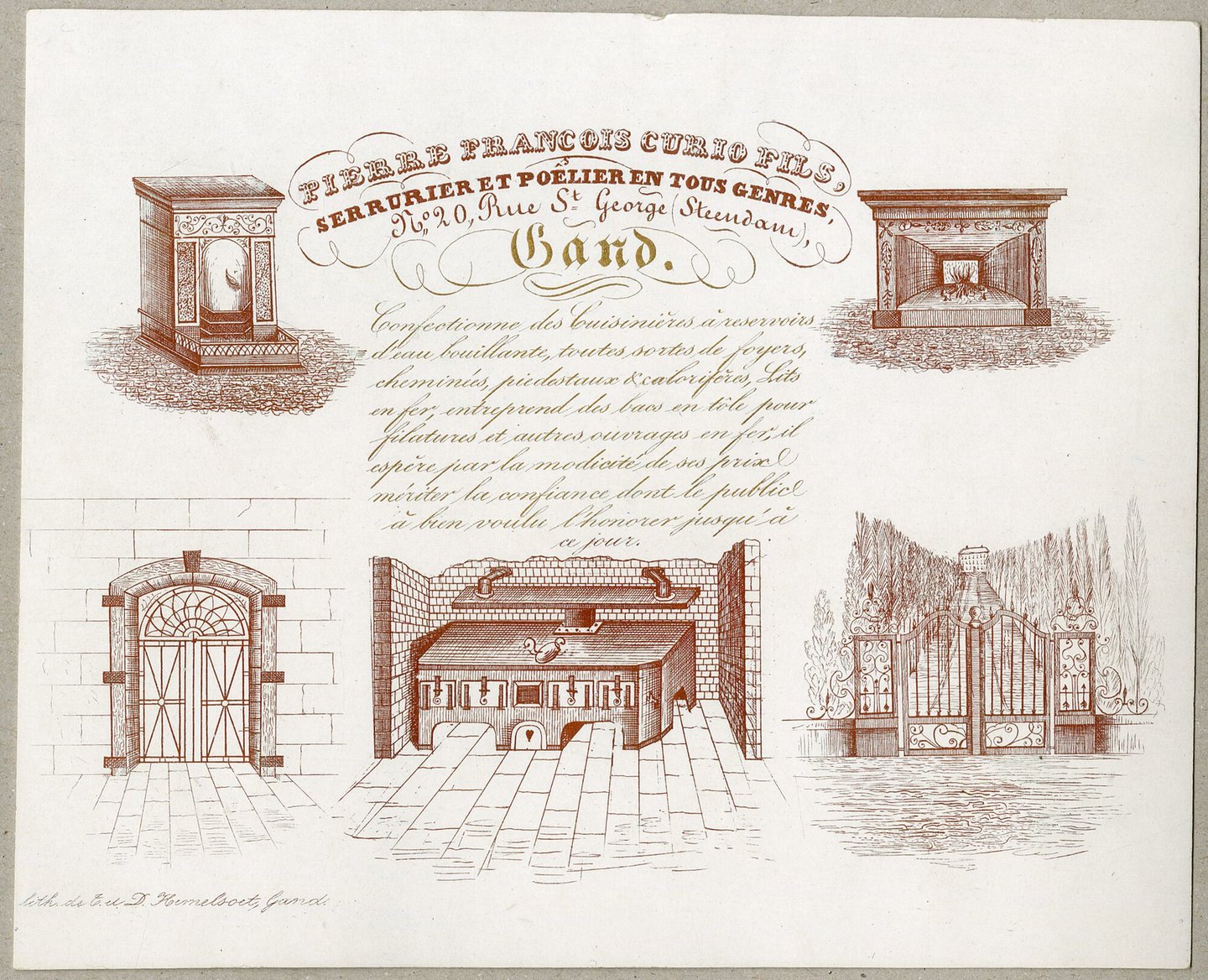 - opschriften: Pierre François Curio Fils, / Serrurier et Poêlier en tous genres, / N°.20, Rue St. George (Steendam), / Gand / Confectionne des Cuisinières à resevoirs / d'eau bouillante, toutes sortes de foyers, / cheminées, piedestaux & caborifères, Lits / en fer, ent