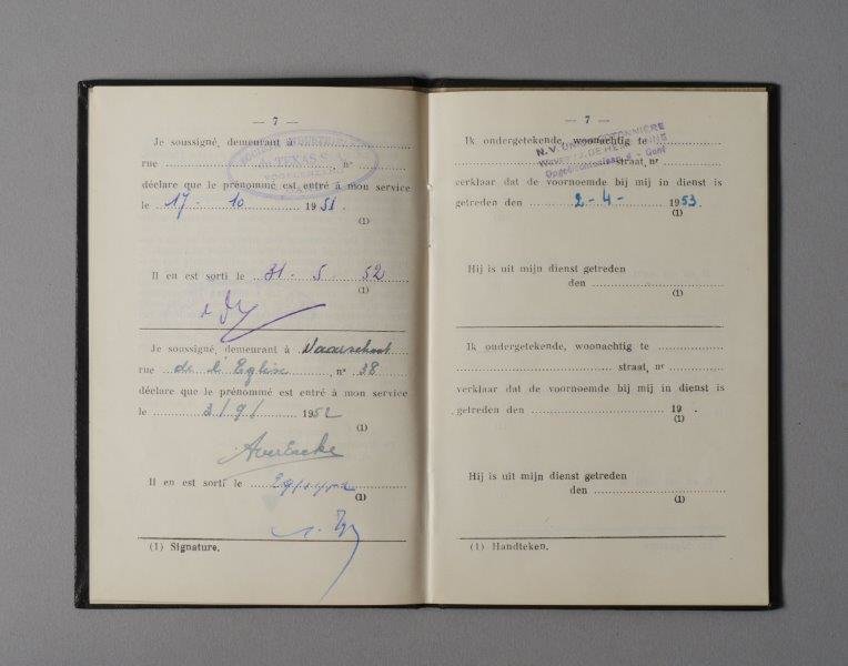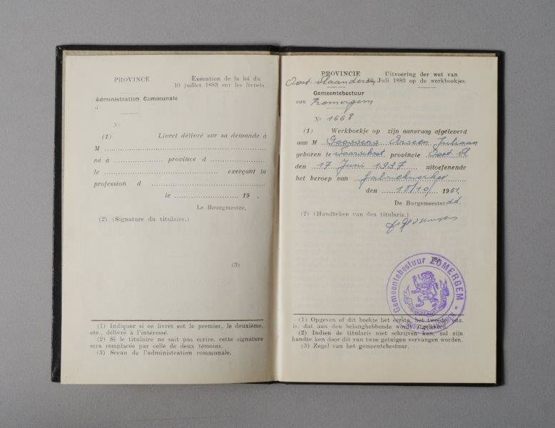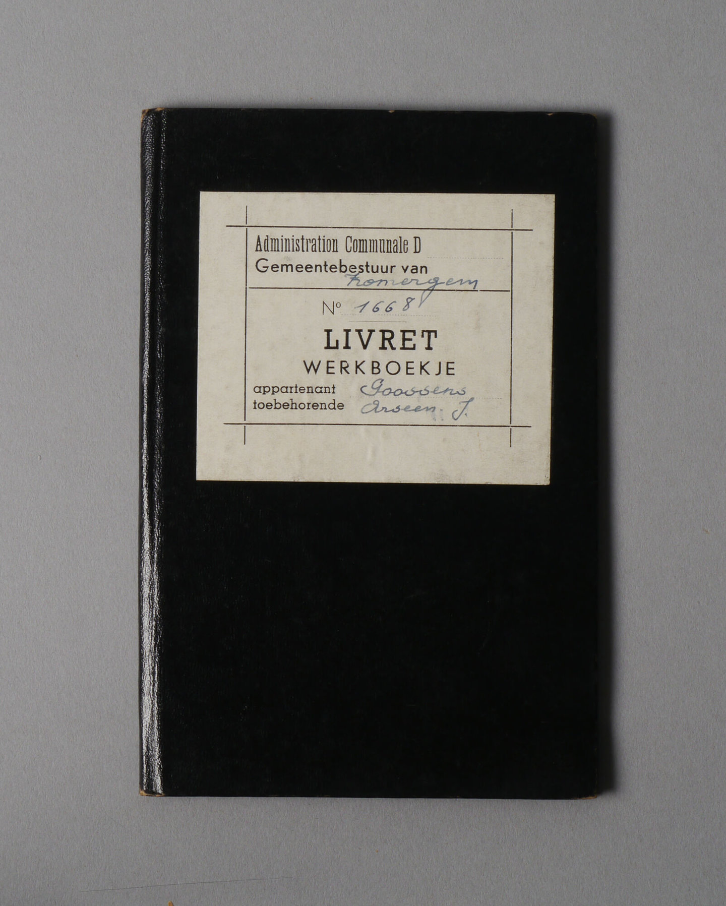 Werkboekje uitgereikt door gemeentebestuur van Zomergem aan Arseen Juliaan Goossens, geboren op 17 juni 1937, man, 14 jaar, fabriekswerker. Datum van afgifte van het boekje: 18/10/1951. Nummer van het boekje: 1668. Datum van eerste indiensttreding: 17/10/1951. Werkgevers: Texas SA (17/10/1951-31/05/1952); rue de L' église 38, Waarschoot (03/09/1952-29/11/1952); Union Cotonnière Weverij Jules De Hemptinne (02/04/1953- ).