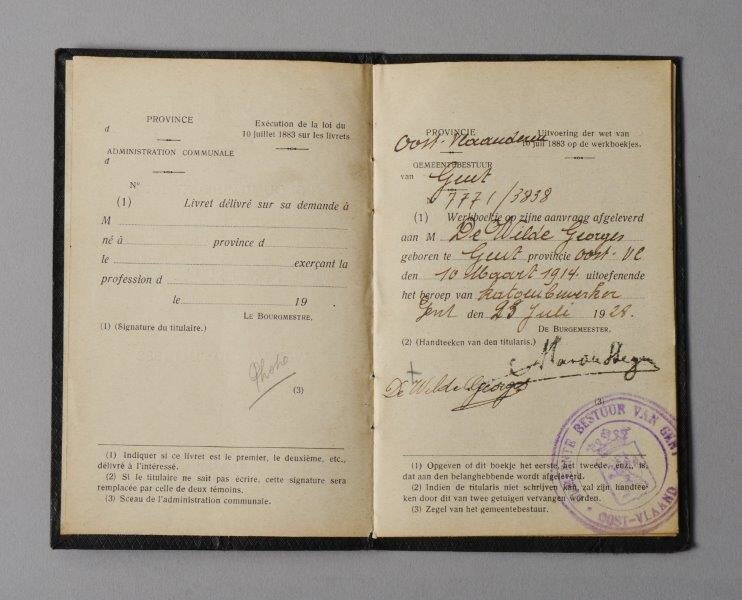 - opschriften: Administration communale de /gemeentebestuur van Gent / n° 7771/3838 /livret/werkboekje/ appartenant/ toebehoorende De wilde Georges