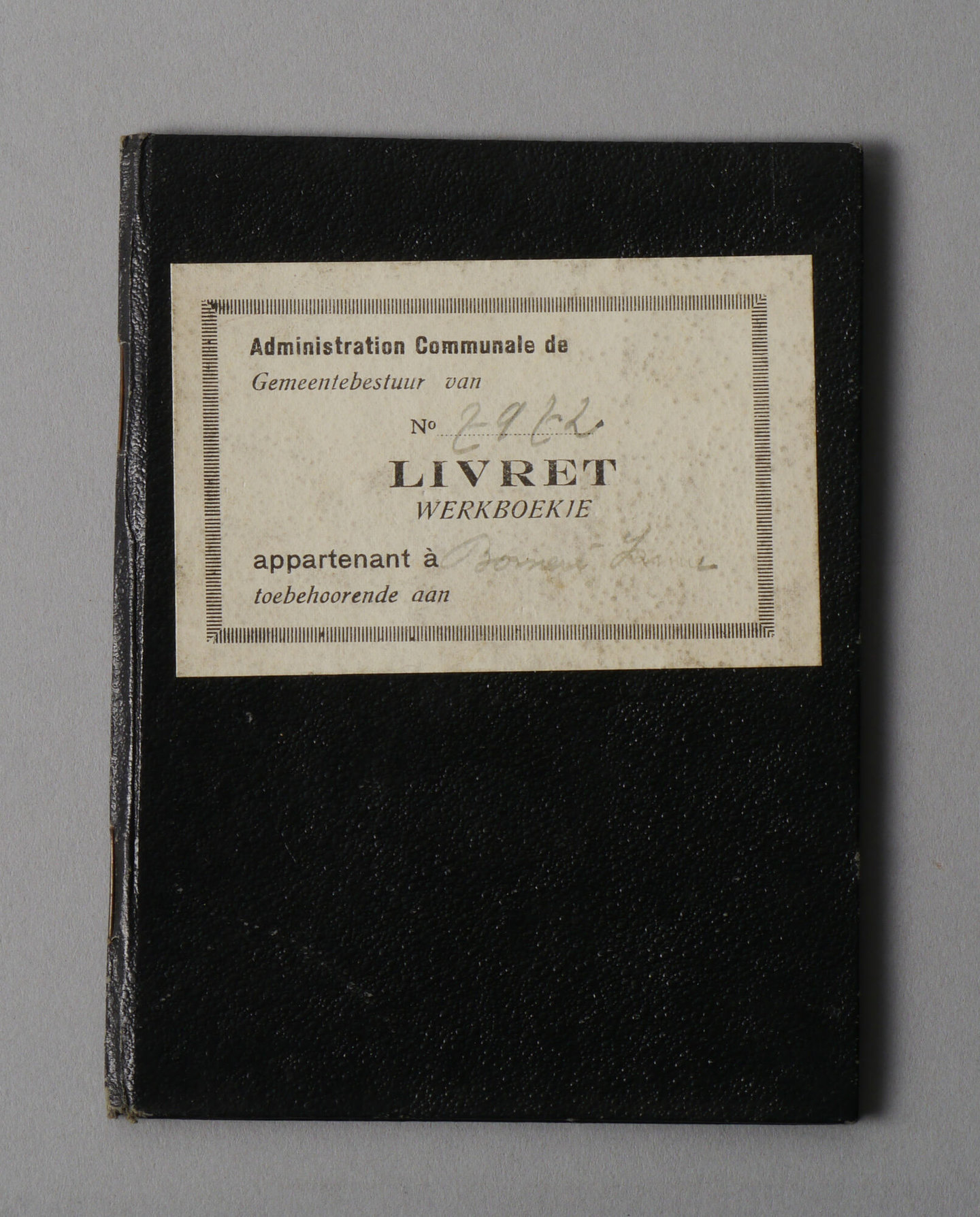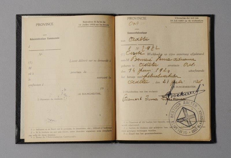 Werkboekje uitgereikt door gemeentebestuur van Aalter aan Irma Adrienne Bomeré, geboren op 14 juni 1924, vrouw, 14 jaar, fabriekswerkster. Datum van afgifte van het boekje: 23/07/1938. Nummer van het boekje: 2972.
