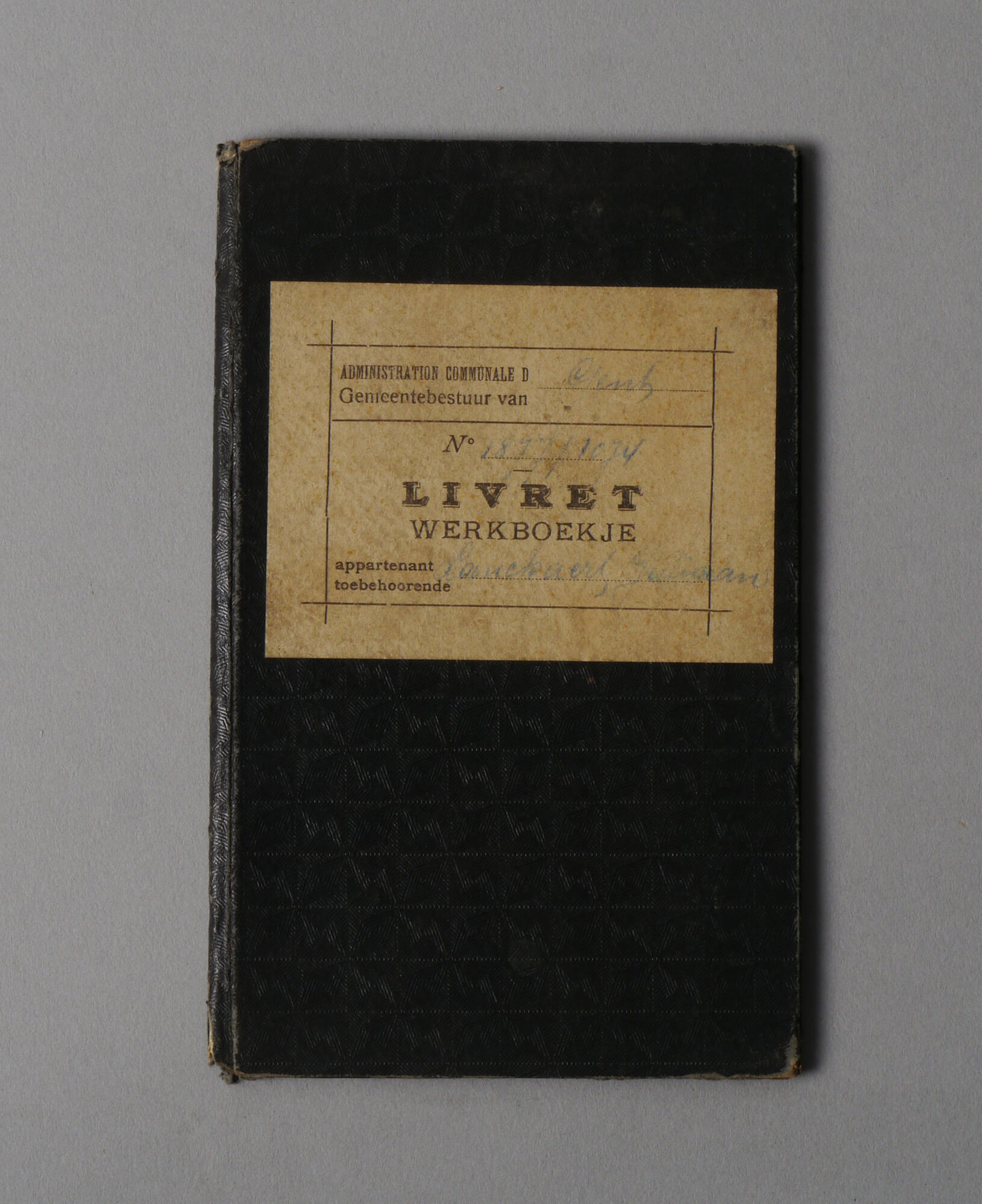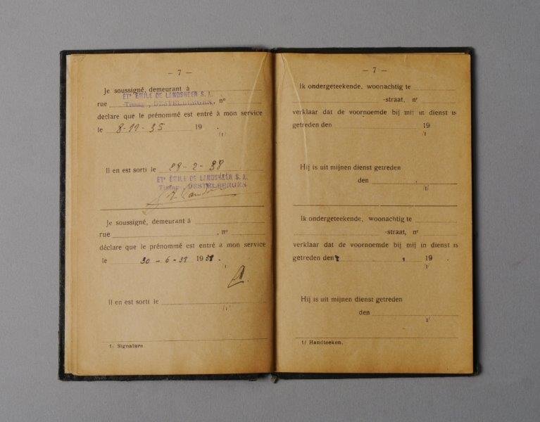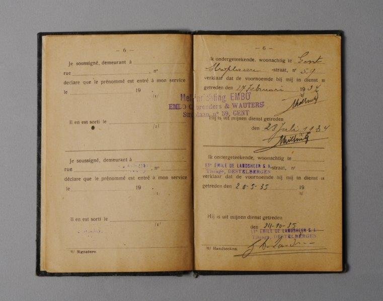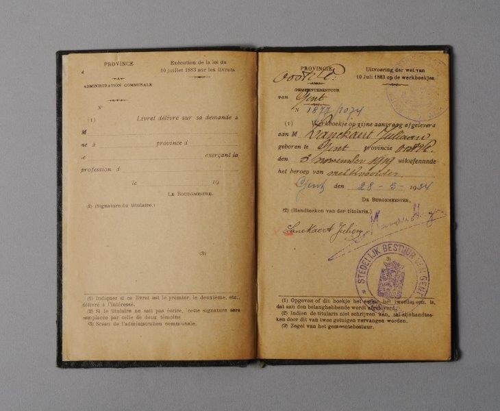 Werkboekje uitgereikt door gemeentebestuur van Gent aan Juliaan Lanckaert, geboren op 3 november 1919, man, 14 jaar, melkvoerder. Datum van afgifte van het boekje: 28/05/1934. Nummer van het boekje: 1877/1074. Datum van eertse indiensttreding: 27/02/1934. Werkgevers: Melkinrichting EMBO Gebroeders & Wauters (27/02/1934-28/07/1934); Tissage Emile De Landsheer SA (20/05/1935-24/10/1935); Tissage Emile De Landsheer SA (08/11/1935-28/02/1938); werkgever niet opgegeven (30/06/1938- ).
